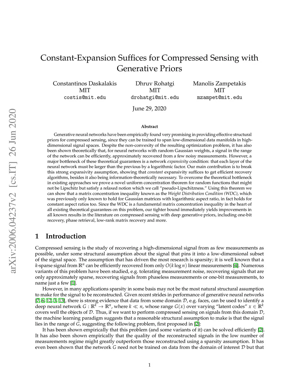 Generative neural networks have been empirically found very promising in providing effective structural priors for compressed sensing, since they can be trained to span low-dimensional data manifolds in high-dimensional signal spaces. Despite the non-convexity of the resulting optimization problem, it has also been shown theoretically that, for neural networks with random Gaussian weights, a signal in the range of the network can be efficiently, approximately recovered from a few noisy measurements. However, a major bottleneck of these theoretical guarantees is a network expansivity condition: that each layer of the neural network must be larger than the previous by a logarithmic factor. Our main contribution is to break this strong expansivity assumption, showing that constant expansivity suffices to get efficient recovery algorithms, besides it also being information-theoretically necessary. To overcome the theoretical bottleneck in existing approaches we prove a novel uniform concentration theorem for random functions that might not be Lipschitz but satisfy a relaxed notion which we call "pseudo-Lipschitzness." Using this theorem we can show that a matrix concentration inequality known as the Weight Distribution Condition (WDC), which was previously only known to hold for Gaussian matrices with logarithmic aspect ratio, in fact holds for constant aspect ratios too. Since the WDC is a fundamental matrix concentration inequality in the heart of all existing theoretical guarantees on this problem, our tighter bound immediately yields improvements in all known results in the literature on compressed sensing with deep generative priors, including one-bit recovery, phase retrieval, low-rank matrix recovery, and more.