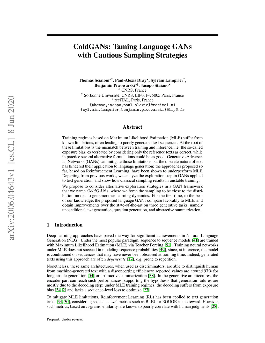 ColdGANs: Taming Language GANs with Cautious Sampling Strategies