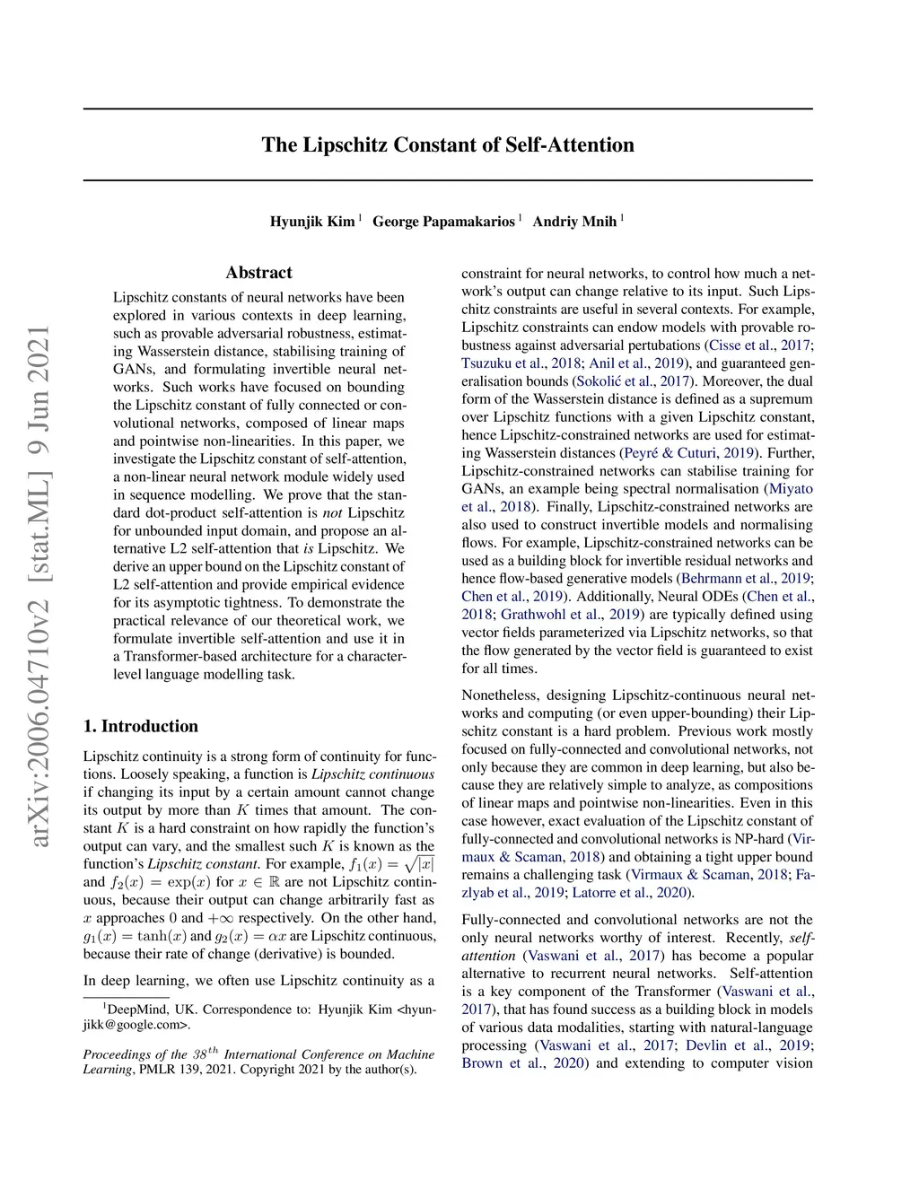 Lipschitz constants of neural networks have been explored in various contexts in deep learning, such as provable adversarial robustness, estimating Wasserstein distance, stabilising training of GANs, and formulating invertible neural networks. Such works have focused on bounding the Lipschitz constant of fully connected or convolutional networks, composed of linear maps and pointwise non-linearities. In this paper, we investigate the Lipschitz constant of self-attention, a non-linear neural network module widely used in sequence modelling. We prove that the standard dot-product self-attention is not Lipschitz for unbounded input domain, and propose an alternative L2 self-attention that is Lipschitz. We derive an upper bound on the Lipschitz constant of L2 self-attention and provide empirical evidence for its asymptotic tightness. To demonstrate the practical relevance of our theoretical work, we formulate invertible self-attention and use it in a Transformer-based architecture for a character-level language modelling task.