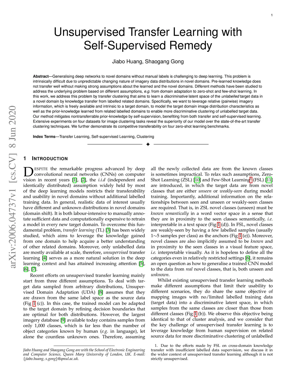 Generalising deep networks to novel domains without manual labels is challenging to deep learning. This problem is intrinsically difficult due to unpredictable changing nature of imagery data distributions in novel domains. Pre-learned knowledge does not transfer well without making strong assumptions about the learned and the novel domains. Different methods have been studied to address the underlying problem based on different assumptions, e.g. from domain adaptation to zero-shot and few-shot learning. In this work, we address this problem by transfer clustering that aims to learn a discriminative latent space of the unlabelled target data in a novel domain by knowledge transfer from labelled related domains. Specifically, we want to leverage relative (pairwise) imagery information, which is freely available and intrinsic to a target domain, to model the target domain image distribution characteristics as well as the prior-knowledge learned from related labelled domains to enable more discriminative clustering of unlabelled target data. Our method mitigates nontransferrable prior-knowledge by self-supervision, benefiting from both transfer and self-supervised learning. Extensive experiments on four datasets for image clustering tasks reveal the superiority of our model over the state-of-the-art transfer clustering techniques. We further demonstrate its competitive transferability on four zero-shot learning benchmarks.