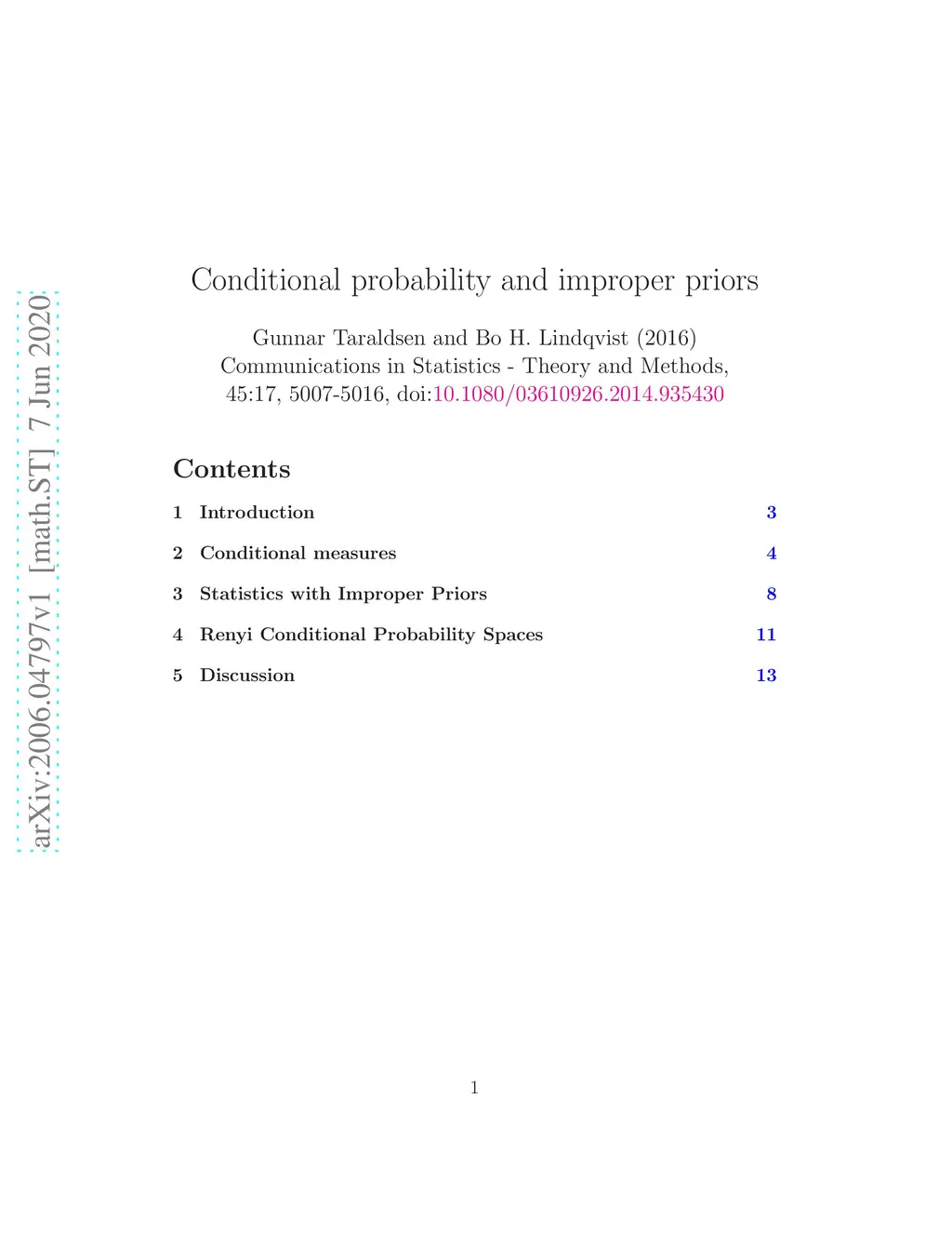 The purpose of this paper is to present a mathematical theory that can be used as a foundation for statistics that include improper priors. This theory includes improper laws in the initial axioms and has in particular Bayes theorem as a consequence. Another consequence is that some of the usual calculation rules are modified. This is important in relation to common statistical practice which usually include improper priors, but tends to use unaltered calculation rules. In some cases the results are valid, but in other cases inconsistencies may appear. The famous marginalization paradoxes exemplify this latter case. An alternative mathematical theory for the foundations of statistics can be formulated in terms of conditional probability spaces. In this case the appearance of improper laws is a consequence of the theory. It is proved here that the resulting mathematical structures for the two theories are equivalent. The conclusion is that the choice of the first or the second formulation for the initial axioms can be considered a matter of personal preference. Readers that initially have concerns regarding improper priors can possibly be more open toward a formulation of the initial axioms in terms of conditional probabilities. The interpretation of an improper law is given by the corresponding conditional probabilities. Keywords: Axioms of statistics, Conditional probability space, Improper prior, Projective space