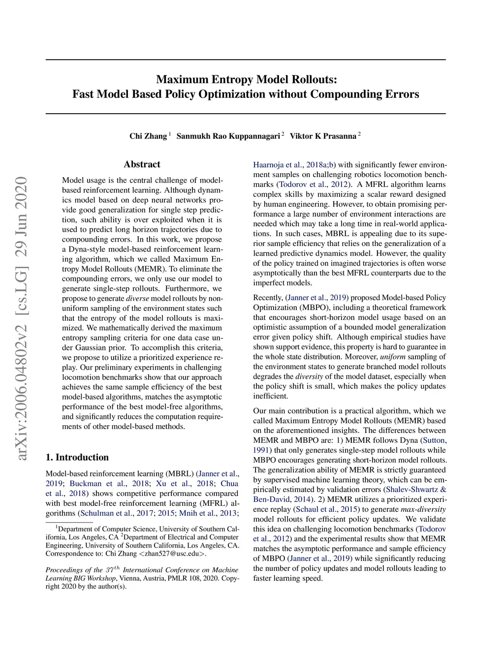 Model usage is the central challenge of model-based reinforcement learning. Although dynamics model based on deep neural networks provide good generalization for single step prediction, such ability is over exploited when it is used to predict long horizon trajectories due to compounding errors. In this work, we propose a Dyna-style model-based reinforcement learning algorithm, which we called Maximum Entropy Model Rollouts (MEMR). To eliminate the compounding errors, we only use our model to generate single-step rollouts. Furthermore, we propose to generate \emph{diverse} model rollouts by non-uniform sampling of the environment states such that the entropy of the model rollouts is maximized. We mathematically derived the maximum entropy sampling criteria for one data case under Gaussian prior. To accomplish this criteria, we propose to utilize a prioritized experience replay. Our preliminary experiments in challenging locomotion benchmarks show that our approach achieves the same sample efficiency of the best model-based algorithms, matches the asymptotic performance of the best model-free algorithms, and significantly reduces the computation requirements of other model-based methods.