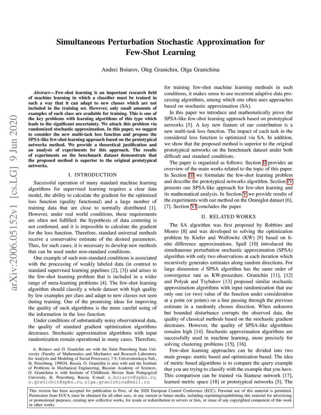 Few-shot learning is an important research field of machine learning in which a classifier must be trained in such a way that it can adapt to new classes which are not included in the training set. However, only small amounts of examples of each class are available for training. This is one of the key problems with learning algorithms of this type which leads to the significant uncertainty. We attack this problem via randomized stochastic approximation. In this paper, we suggest to consider the new multi-task loss function and propose the SPSA-like few-shot learning approach based on the prototypical networks method. We provide a theoretical justification and an analysis of experiments for this approach. The results of experiments on the benchmark dataset demonstrate that the proposed method is superior to the original prototypical networks.