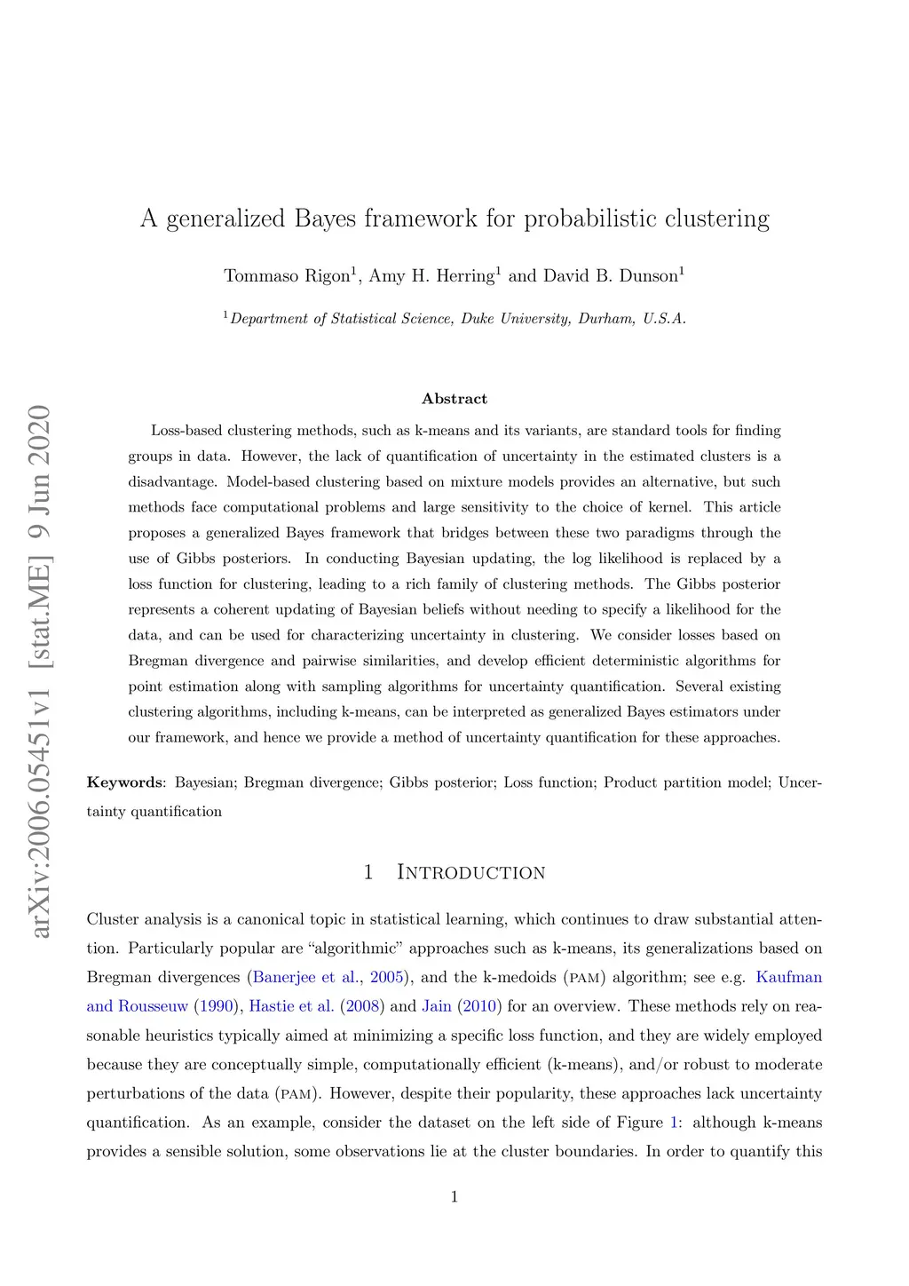 Loss-based clustering methods, such as k-means and its variants, are standard tools for finding groups in data. However, the lack of quantification of uncertainty in the estimated clusters is a disadvantage. Model-based clustering based on mixture models provides an alternative, but such methods face computational problems and large sensitivity to the choice of kernel. This article proposes a generalized Bayes framework that bridges between these two paradigms through the use of Gibbs posteriors. In conducting Bayesian updating, the log likelihood is replaced by a loss function for clustering, leading to a rich family of clustering methods. The Gibbs posterior represents a coherent updating of Bayesian beliefs without needing to specify a likelihood for the data, and can be used for characterizing uncertainty in clustering. We consider losses based on Bregman divergence and pairwise similarities, and develop efficient deterministic algorithms for point estimation along with sampling algorithms for uncertainty quantification. Several existing clustering algorithms, including k-means, can be interpreted as generalized Bayes estimators under our framework, and hence we provide a method of uncertainty quantification for these approaches.