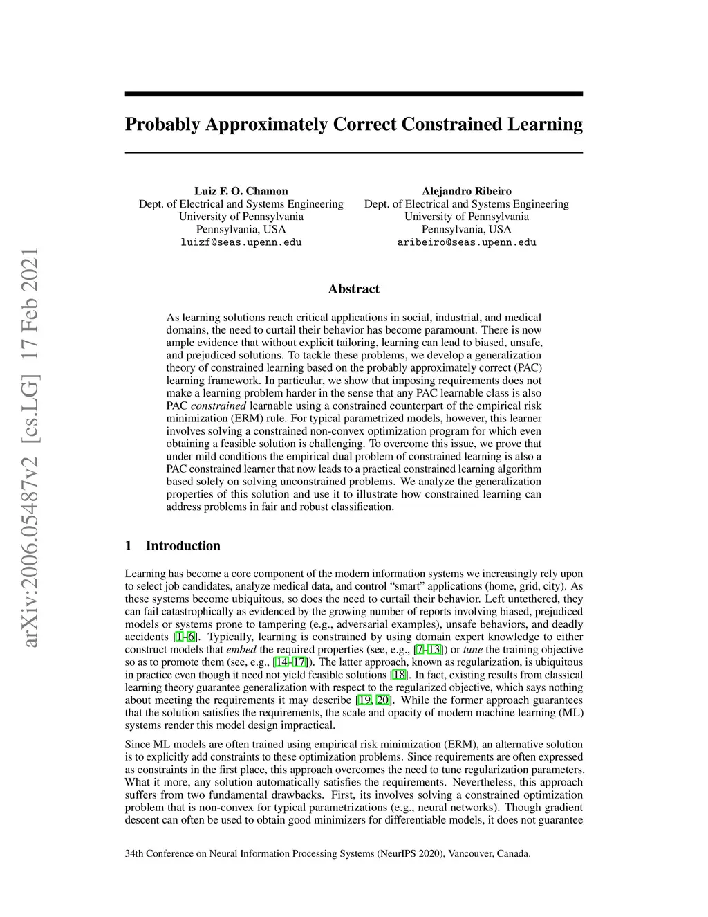 As learning solutions reach critical applications in social, industrial, and medical domains, the need to curtail their behavior has become paramount. There is now ample evidence that without explicit tailoring, learning can lead to biased, unsafe, and prejudiced solutions. To tackle these problems, we develop a generalization theory of constrained learning based on the probably approximately correct (PAC) learning framework. In particular, we show that imposing requirements does not make a learning problem harder in the sense that any PAC learnable class is also PAC constrained learnable using a constrained counterpart of the empirical risk minimization (ERM) rule. For typical parametrized models, however, this learner involves solving a constrained non-convex optimization program for which even obtaining a feasible solution is challenging. To overcome this issue, we prove that under mild conditions the empirical dual problem of constrained learning is also a PAC constrained learner that now leads to a practical constrained learning algorithm based solely on solving unconstrained problems. We analyze the generalization properties of this solution and use it to illustrate how constrained learning can address problems in fair and robust classification.