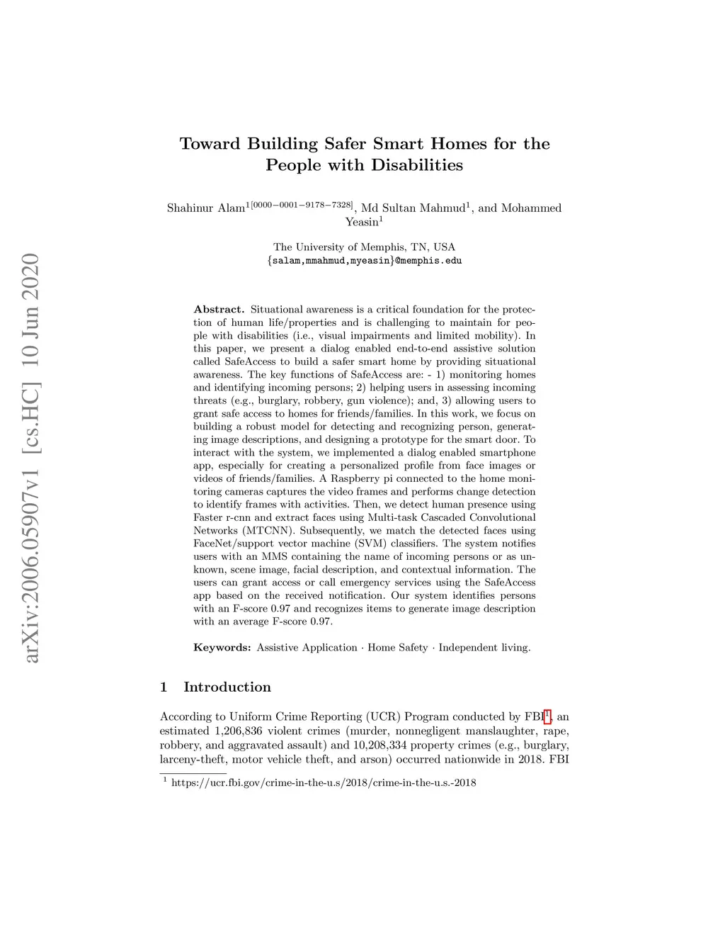 Situational awareness is a critical foundation for the protection of human life/properties and is challenging to maintain for people with disabilities (i.e., visual impairments and limited mobility). In this paper, we present a dialog enabled end-to-end assistive solution called "SafeAccess" to build a safer smart home by providing situational awareness. The key functions of SafeAccess are: - 1) monitoring homes and identifying incoming persons; 2) helping users in assessing incoming threats (e.g., burglary, robbery, gun violence); and, 3) allowing users to grant safe access to homes for friends/families. In this work, we focus on building a robust model for detecting and recognizing person, generating image descriptions, and designing a prototype for the smart door. To interact with the system, we implemented a dialog enabled smartphone app, especially for creating a personalized profile from face images or videos of friends/families. A Raspberry pi connected to the home monitoring cameras captures the video frames and performs change detection to identify frames with activities. Then, we detect human presence using Faster r-cnn and extract faces using Multi-task Cascaded Convolutional Networks (MTCNN). Subsequently, we match the detected faces using FaceNet/support vector machine (SVM) classifiers. The system notifies users with an MMS containing the name of incoming persons or as "unknown", scene image, facial description, and contextual information. The users can grant access or call emergency services using the SafeAccess app based on the received notification. Our system identifies persons with an F-score 0.97 and recognizes items to generate image description with an average F-score 0.97.