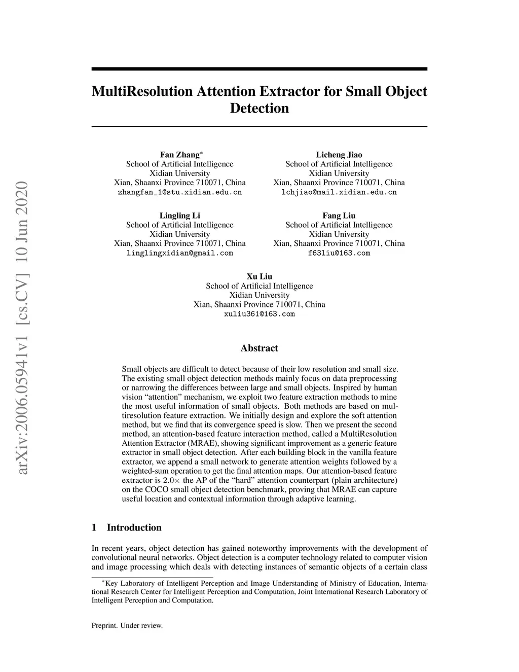 Small objects are difficult to detect because of their low resolution and small size. The existing small object detection methods mainly focus on data preprocessing or narrowing the differences between large and small objects. Inspired by human vision "attention" mechanism, we exploit two feature extraction methods to mine the most useful information of small objects. Both methods are based on multiresolution feature extraction. We initially design and explore the soft attention method, but we find that its convergence speed is slow. Then we present the second method, an attention-based feature interaction method, called a MultiResolution Attention Extractor (MRAE), showing significant improvement as a generic feature extractor in small object detection. After each building block in the vanilla feature extractor, we append a small network to generate attention weights followed by a weighted-sum operation to get the final attention maps. Our attention-based feature extractor is 2.0 times the AP of the "hard" attention counterpart (plain architecture) on the COCO small object detection benchmark, proving that MRAE can capture useful location and contextual information through adaptive learning.
