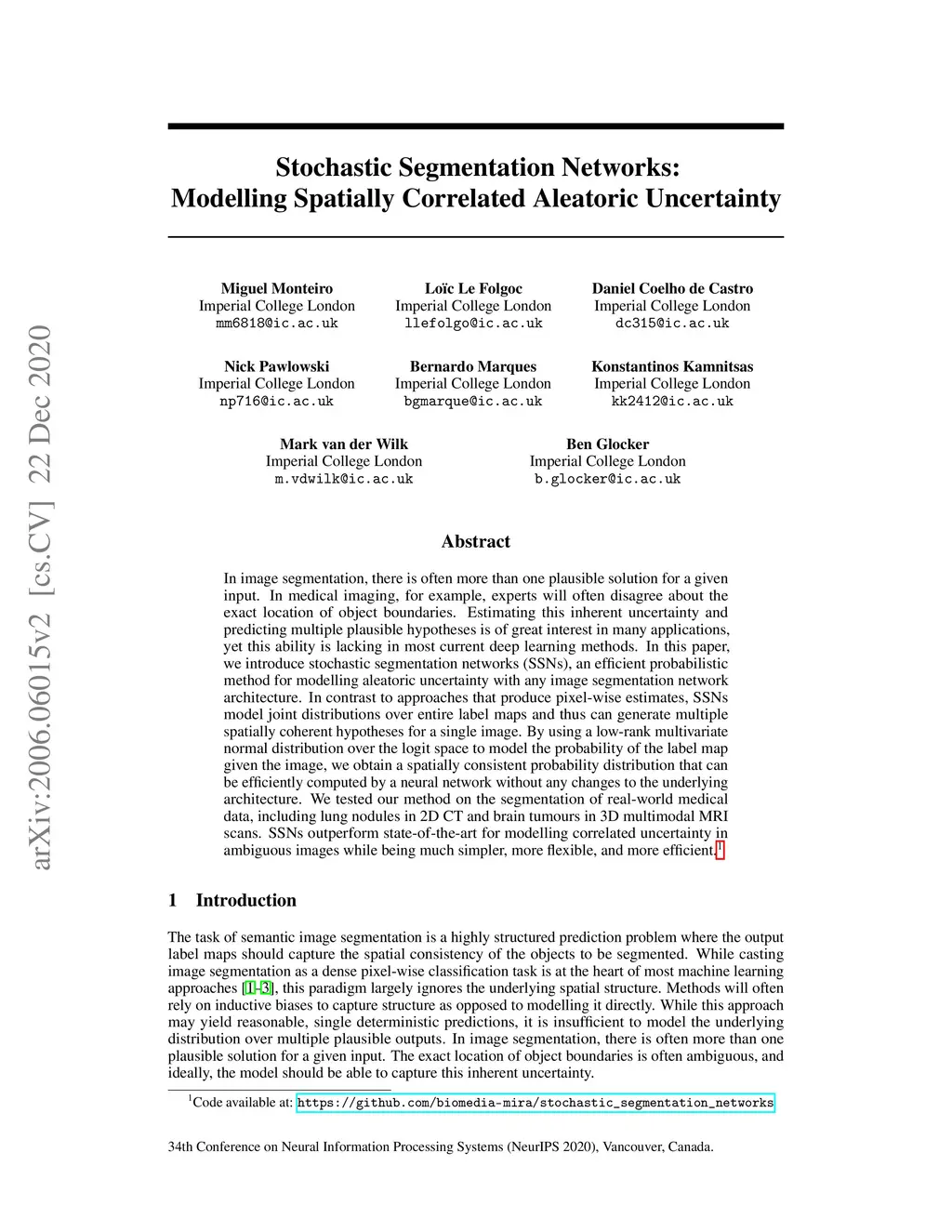 In image segmentation, there is often more than one plausible solution for a given input. In medical imaging, for example, experts will often disagree about the exact location of object boundaries. Estimating this inherent uncertainty and predicting multiple plausible hypotheses is of great interest in many applications, yet this ability is lacking in most current deep learning methods. In this paper, we introduce stochastic segmentation networks (SSNs), an efficient probabilistic method for modelling aleatoric uncertainty with any image segmentation network architecture. In contrast to approaches that produce pixel-wise estimates, SSNs model joint distributions over entire label maps and thus can generate multiple spatially coherent hypotheses for a single image. By using a low-rank multivariate normal distribution over the logit space to model the probability of the label map given the image, we obtain a spatially consistent probability distribution that can be efficiently computed by a neural network without any changes to the underlying architecture. We tested our method on the segmentation of real-world medical data, including lung nodules in 2D CT and brain tumours in 3D multimodal MRI scans. SSNs outperform state-of-the-art for modelling correlated uncertainty in ambiguous images while being much simpler, more flexible, and more efficient.