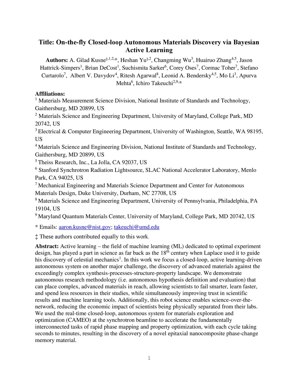 Active learning - the field of machine learning (ML) dedicated to optimal experiment design, has played a part in science as far back as the 18th century when Laplace used it to guide his discovery of celestial mechanics [1]. In this work we focus a closed-loop, active learning-driven autonomous system on another major challenge, the discovery of advanced materials against the exceedingly complex synthesis-processes-structure-property landscape. We demonstrate autonomous research methodology (i.e. autonomous hypothesis definition and evaluation) that can place complex, advanced materials in reach, allowing scientists to fail smarter, learn faster, and spend less resources in their studies, while simultaneously improving trust in scientific results and machine learning tools. Additionally, this robot science enables science-over-the-network, reducing the economic impact of scientists being physically separated from their labs. We used the real-time closed-loop, autonomous system for materials exploration and optimization (CAMEO) at the synchrotron beamline to accelerate the fundamentally interconnected tasks of rapid phase mapping and property optimization, with each cycle taking seconds to minutes, resulting in the discovery of a novel epitaxial nanocomposite phase-change memory material.