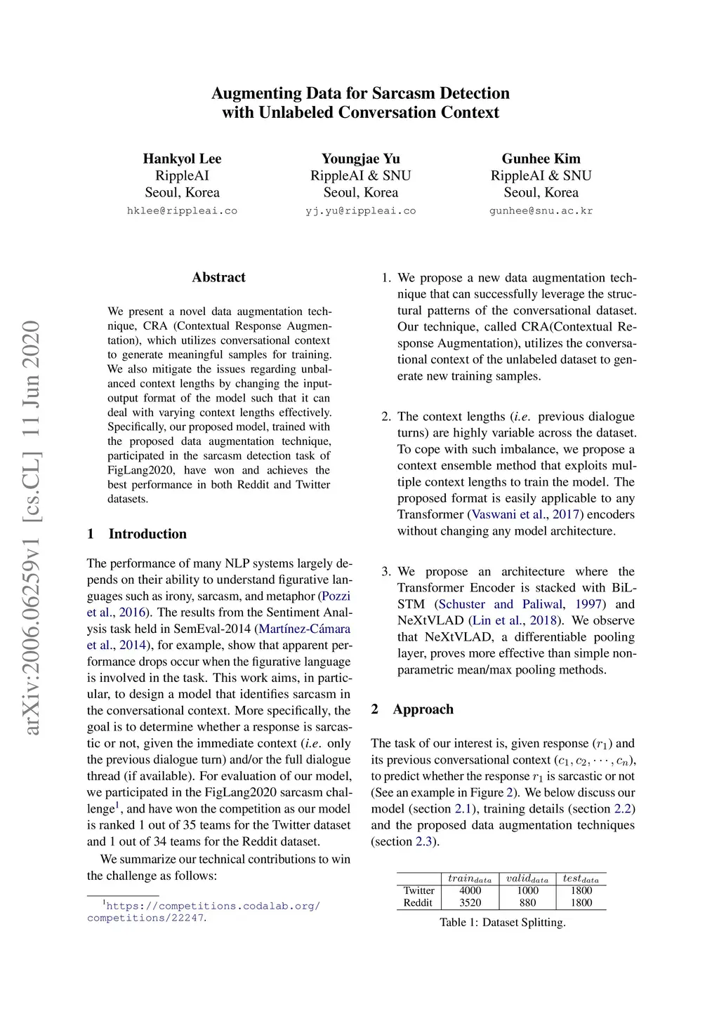 We present a novel data augmentation technique, CRA (Contextual Response Augmentation), which utilizes conversational context to generate meaningful samples for training. We also mitigate the issues regarding unbalanced context lengths by changing the input-output format of the model such that it can deal with varying context lengths effectively. Specifically, our proposed model, trained with the proposed data augmentation technique, participated in the sarcasm detection task of FigLang2020, have won and achieves the best performance in both Reddit and Twitter datasets.