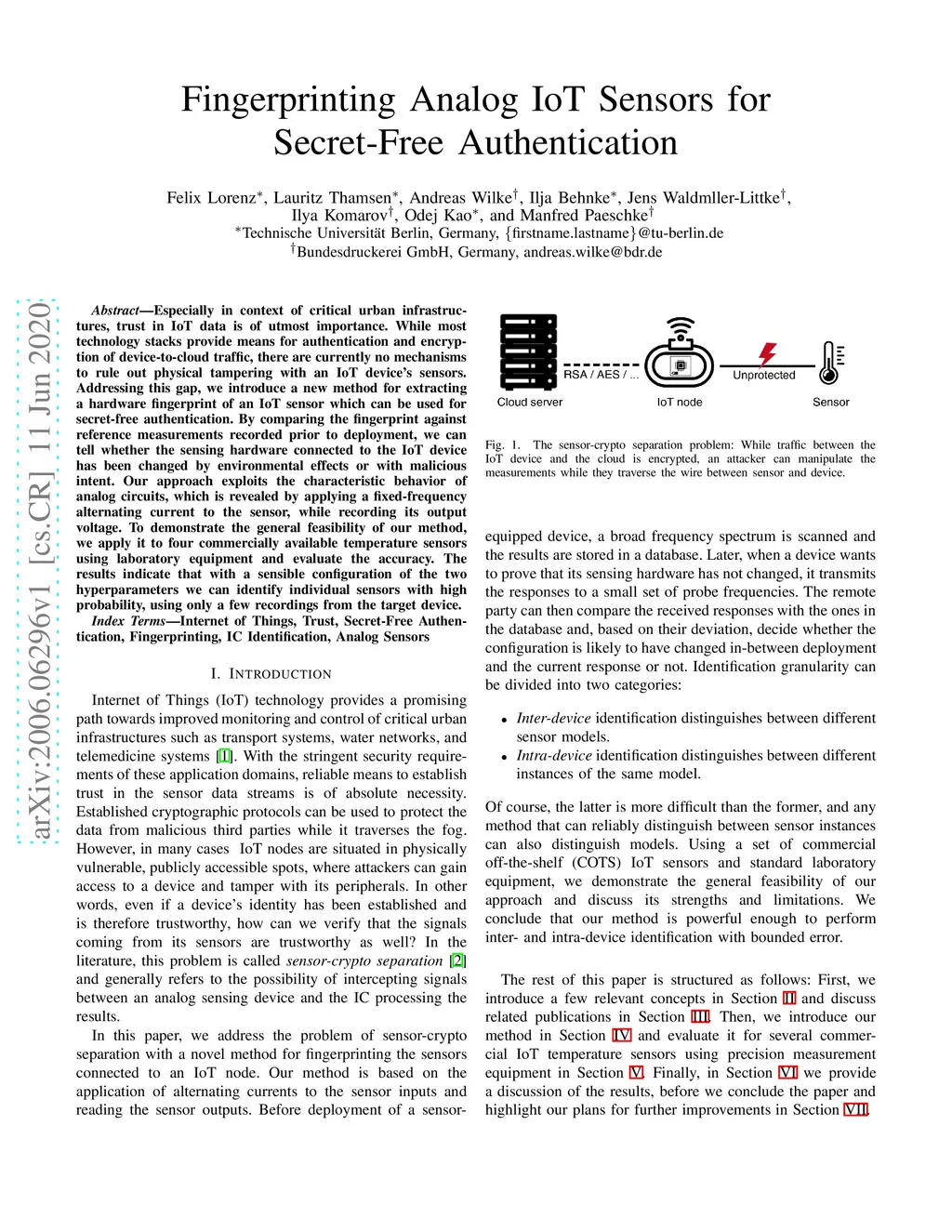 Especially in context of critical urban infrastructures, trust in IoT data is of utmost importance. While most technology stacks provide means for authentication and encryption of device-to-cloud traffic, there are currently no mechanisms to rule out physical tampering with an IoT device's sensors. Addressing this gap, we introduce a new method for extracting a hardware fingerprint of an IoT sensor which can be used for secret-free authentication. By comparing the fingerprint against reference measurements recorded prior to deployment, we can tell whether the sensing hardware connected to the IoT device has been changed by environmental effects or with malicious intent. Our approach exploits the characteristic behavior of analog circuits, which is revealed by applying a fixed-frequency alternating current to the sensor, while recording its output voltage. To demonstrate the general feasibility of our method, we apply it to four commercially available temperature sensors using laboratory equipment and evaluate the accuracy. The results indicate that with a sensible configuration of the two hyperparameters we can identify individual sensors with high probability, using only a few recordings from the target device.