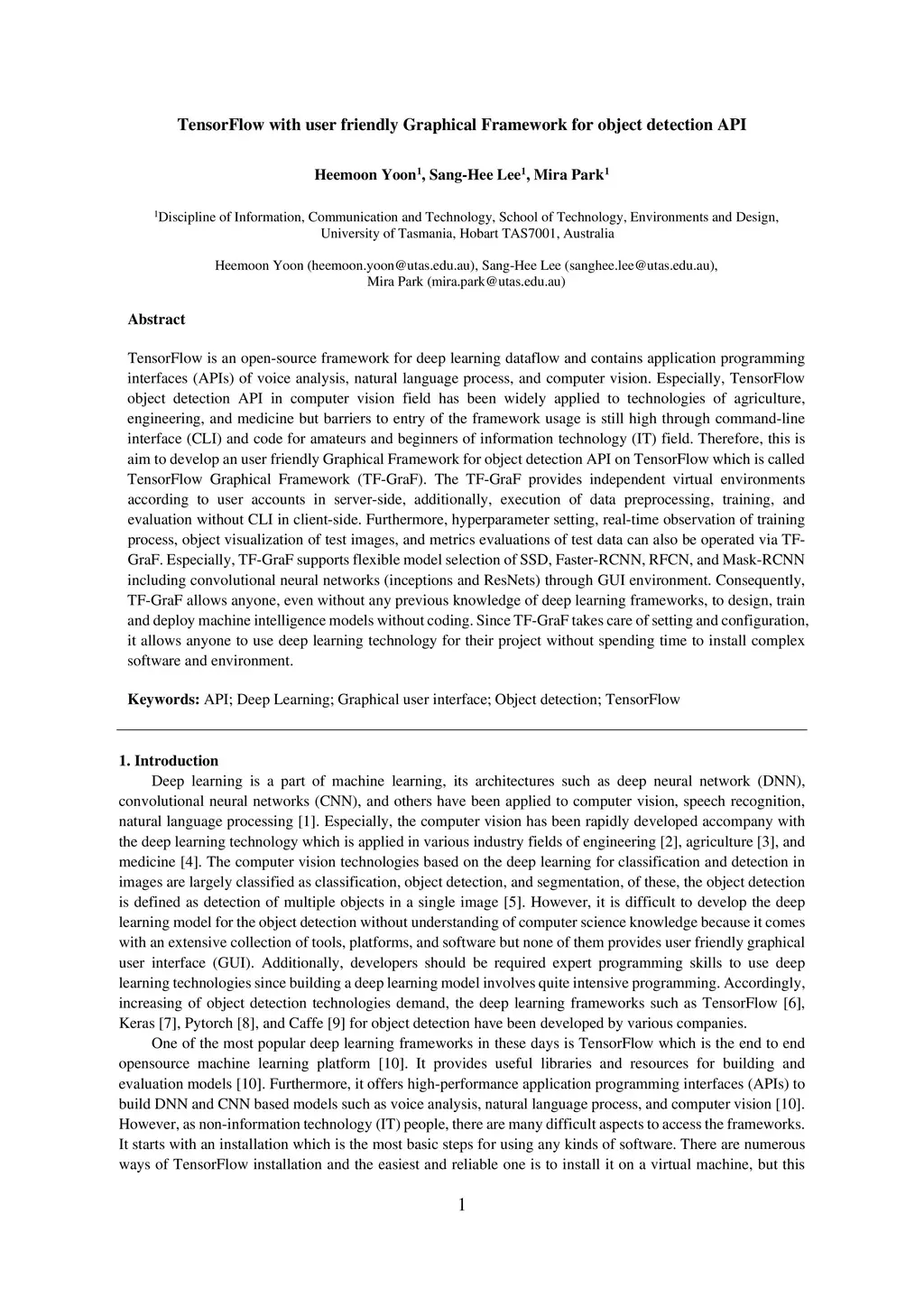 TensorFlow is an open-source framework for deep learning dataflow and contains application programming interfaces (APIs) of voice analysis, natural language process, and computer vision. Especially, TensorFlow object detection API in computer vision field has been widely applied to technologies of agriculture, engineering, and medicine but barriers to entry of the framework usage is still high through command-line interface (CLI) and code for amateurs and beginners of information technology (IT) field. Therefore, this is aim to develop an user friendly Graphical Framework for object detection API on TensorFlow which is called TensorFlow Graphical Framework (TF-GraF). The TF-GraF provides independent virtual environments according to user accounts in server-side, additionally, execution of data preprocessing, training, and evaluation without CLI in client-side. Furthermore, hyperparameter setting, real-time observation of training process, object visualization of test images, and metrics evaluations of test data can also be operated via TF-GraF. Especially, TF-GraF supports flexible model selection of SSD, Faster-RCNN, RFCN, and Mask-RCNN including convolutional neural networks (inceptions and ResNets) through GUI environment. Consequently, TF-GraF allows anyone, even without any previous knowledge of deep learning frameworks, to design, train and deploy machine intelligence models without coding. Since TF-GraF takes care of setting and configuration, it allows anyone to use deep learning technology for their project without spending time to install complex software and environment.