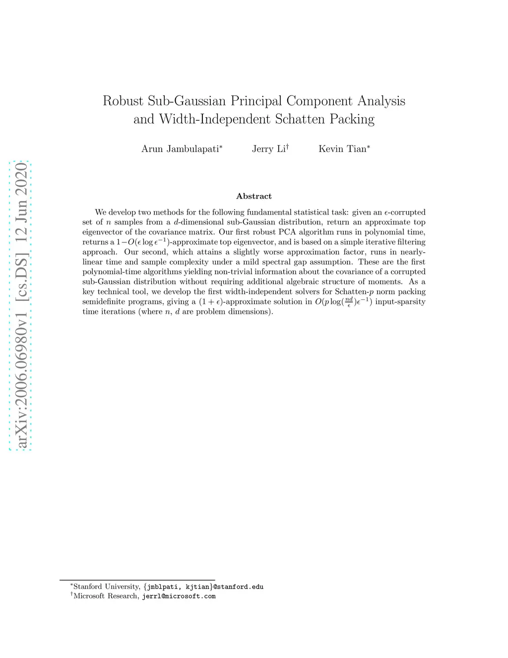 We develop two methods for the following fundamental statistical task: given an -corrupted set of samples from a -dimensional sub-Gaussian distribution, return an approximate top eigenvector of the covariance matrix. Our first robust PCA algorithm runs in polynomial time, returns a -approximate top eigenvector, and is based on a simple iterative filtering approach. Our second, which attains a slightly worse approximation factor, runs in nearly-linear time and sample complexity under a mild spectral gap assumption. These are the first polynomial-time algorithms yielding non-trivial information about the covariance of a corrupted sub-Gaussian distribution without requiring additional algebraic structure of moments. As a key technical tool, we develop the first width-independent solvers for Schatten- norm packing semidefinite programs, giving a -approximate solution in input-sparsity time iterations (where , are problem dimensions).