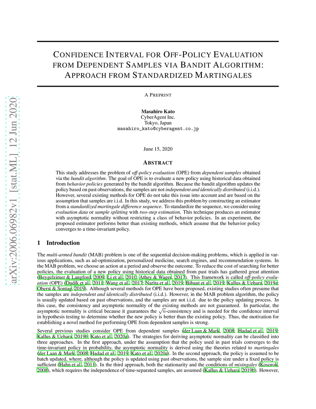 This study addresses the problem of off-policy evaluation (OPE) from dependent samples obtained via the bandit algorithm. The goal of OPE is to evaluate a new policy using historical data obtained from behavior policies generated by the bandit algorithm. Because the bandit algorithm updates the policy based on past observations, the samples are not independent and identically distributed (i.i.d.). However, several existing methods for OPE do not take this issue into account and are based on the assumption that samples are i.i.d. In this study, we address this problem by constructing an estimator from a standardized martingale difference sequence. To standardize the sequence, we consider using evaluation data or sample splitting with a two-step estimation. This technique produces an estimator with asymptotic normality without restricting a class of behavior policies. In an experiment, the proposed estimator performs better than existing methods, which assume that the behavior policy converges to a time-invariant policy.