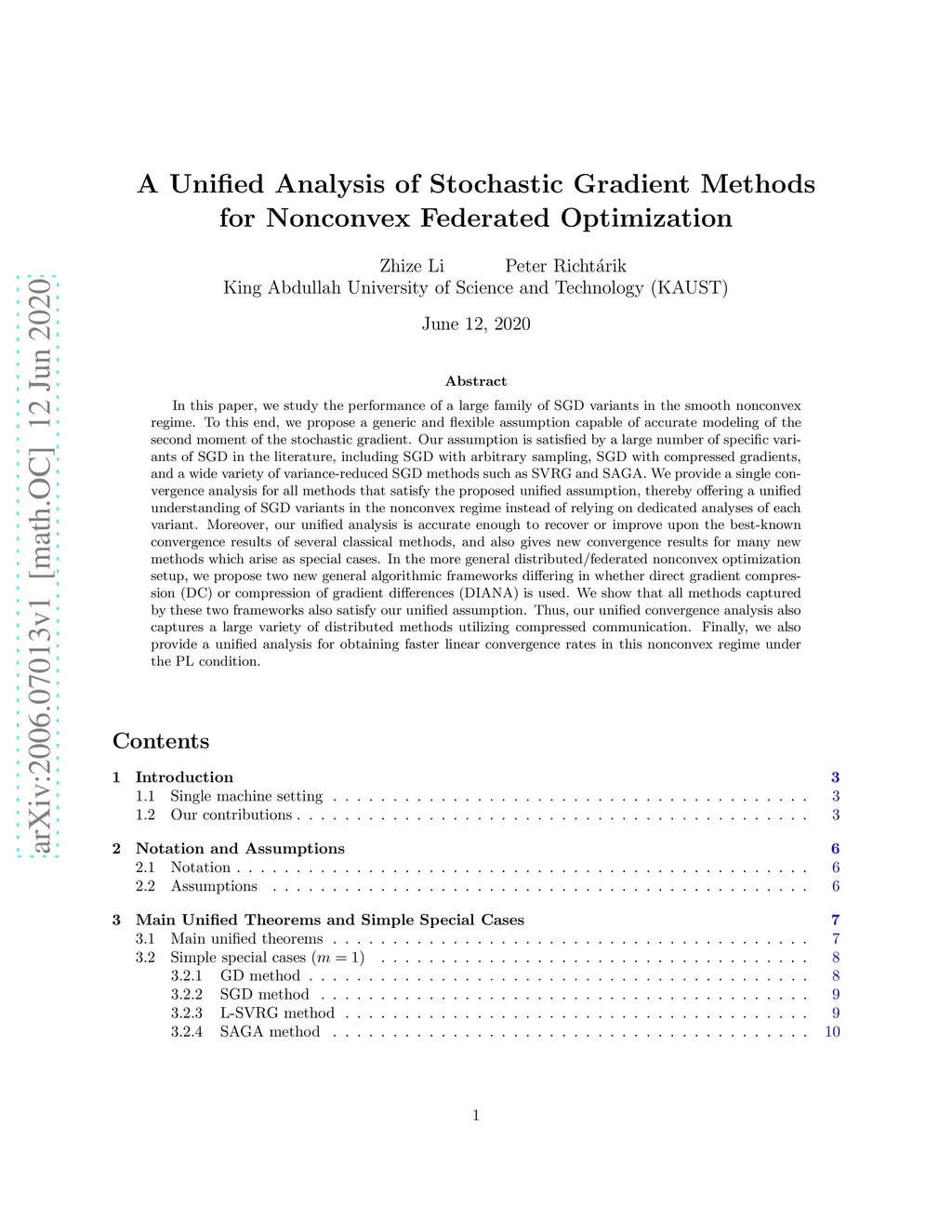 In this paper, we study the performance of a large family of SGD variants in the smooth nonconvex regime. To this end, we propose a generic and flexible assumption capable of accurate modeling of the second moment of the stochastic gradient. Our assumption is satisfied by a large number of specific variants of SGD in the literature, including SGD with arbitrary sampling, SGD with compressed gradients, and a wide variety of variance-reduced SGD methods such as SVRG and SAGA. We provide a single convergence analysis for all methods that satisfy the proposed unified assumption, thereby offering a unified understanding of SGD variants in the nonconvex regime instead of relying on dedicated analyses of each variant. Moreover, our unified analysis is accurate enough to recover or improve upon the best-known convergence results of several classical methods, and also gives new convergence results for many new methods which arise as special cases. In the more general distributed/federated nonconvex optimization setup, we propose two new general algorithmic frameworks differing in whether direct gradient compression (DC) or compression of gradient differences (DIANA) is used. We show that all methods captured by these two frameworks also satisfy our unified assumption. Thus, our unified convergence analysis also captures a large variety of distributed methods utilizing compressed communication. Finally, we also provide a unified analysis for obtaining faster linear convergence rates in this nonconvex regime under the PL condition.