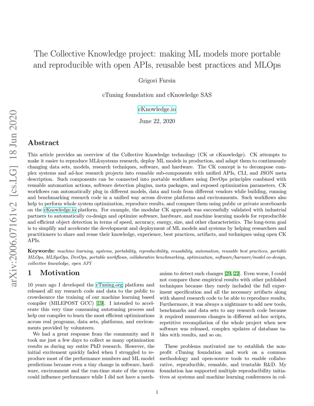 This article provides an overview of the Collective Knowledge technology (CK or cKnowledge). CK attempts to make it easier to reproduce ML&systems research, deploy ML models in production, and adapt them to continuously changing data sets, models, research techniques, software, and hardware. The CK concept is to decompose complex systems and ad-hoc research projects into reusable sub-components with unified APIs, CLI, and JSON meta description. Such components can be connected into portable workflows using DevOps principles combined with reusable automation actions, software detection plugins, meta packages, and exposed optimization parameters. CK workflows can automatically plug in different models, data and tools from different vendors while building, running and benchmarking research code in a unified way across diverse platforms and environments. Such workflows also help to perform whole system optimization, reproduce results, and compare them using public or private scoreboards on the CK platform (https://cKnowledge.io). For example, the modular CK approach was successfully validated with industrial partners to automatically co-design and optimize software, hardware, and machine learning models for reproducible and efficient object detection in terms of speed, accuracy, energy, size, and other characteristics. The long-term goal is to simplify and accelerate the development and deployment of ML models and systems by helping researchers and practitioners to share and reuse their knowledge, experience, best practices, artifacts, and techniques using open CK APIs.
