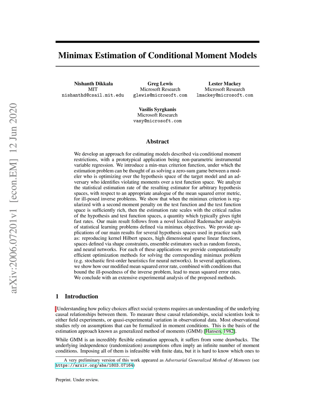 We develop an approach for estimating models described via conditional moment restrictions, with a prototypical application being non-parametric instrumental variable regression. We introduce a min-max criterion function, under which the estimation problem can be thought of as solving a zero-sum game between a modeler who is optimizing over the hypothesis space of the target model and an adversary who identifies violating moments over a test function space. We analyze the statistical estimation rate of the resulting estimator for arbitrary hypothesis spaces, with respect to an appropriate analogue of the mean squared error metric, for ill-posed inverse problems. We show that when the minimax criterion is regularized with a second moment penalty on the test function and the test function space is sufficiently rich, then the estimation rate scales with the critical radius of the hypothesis and test function spaces, a quantity which typically gives tight fast rates. Our main result follows from a novel localized Rademacher analysis of statistical learning problems defined via minimax objectives. We provide applications of our main results for several hypothesis spaces used in practice such as: reproducing kernel Hilbert spaces, high dimensional sparse linear functions, spaces defined via shape constraints, ensemble estimators such as random forests, and neural networks. For each of these applications we provide computationally efficient optimization methods for solving the corresponding minimax problem (e.g. stochastic first-order heuristics for neural networks). In several applications, we show how our modified mean squared error rate, combined with conditions that bound the ill-posedness of the inverse problem, lead to mean squared error rates. We conclude with an extensive experimental analysis of the proposed methods.