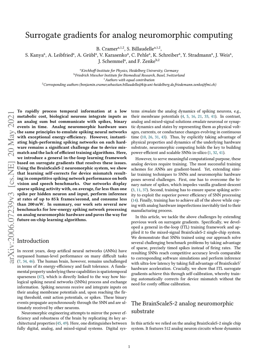 To rapidly process temporal information at a low metabolic cost, biological neurons integrate inputs as an analog sum but communicate with spikes, binary events in time. Analog neuromorphic hardware uses the same principles to emulate spiking neural networks with exceptional energy-efficiency. However, instantiating high-performing spiking networks on such hardware remains a significant challenge due to device mismatch and the lack of efficient training algorithms. Here, we introduce a general in-the-loop learning framework based on surrogate gradients that resolves these issues. Using the BrainScaleS-2 neuromorphic system, we show that learning self-corrects for device mismatch resulting in competitive spiking network performance on both vision and speech benchmarks. Our networks display sparse spiking activity with, on average, far less than one spike per hidden neuron and input, perform inference at rates of up to 85 k frames/second, and consume less than 200 mW. In summary, our work sets several new benchmarks for low-energy spiking network processing on analog neuromorphic hardware and paves the way for future on-chip learning algorithms.