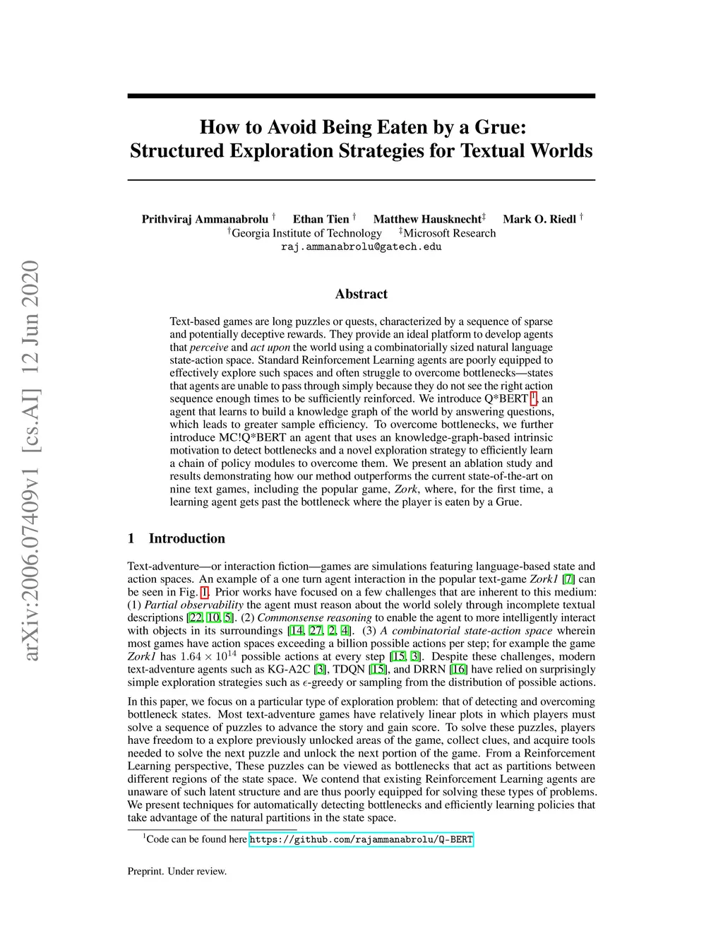 Text-based games are long puzzles or quests, characterized by a sequence of sparse and potentially deceptive rewards. They provide an ideal platform to develop agents that perceive and act upon the world using a combinatorially sized natural language state-action space. Standard Reinforcement Learning agents are poorly equipped to effectively explore such spaces and often struggle to overcome bottlenecks---states that agents are unable to pass through simply because they do not see the right action sequence enough times to be sufficiently reinforced. We introduce Q*BERT, an agent that learns to build a knowledge graph of the world by answering questions, which leads to greater sample efficiency. To overcome bottlenecks, we further introduce MC!Q*BERT an agent that uses an knowledge-graph-based intrinsic motivation to detect bottlenecks and a novel exploration strategy to efficiently learn a chain of policy modules to overcome them. We present an ablation study and results demonstrating how our method outperforms the current state-of-the-art on nine text games, including the popular game, Zork, where, for the first time, a learning agent gets past the bottleneck where the player is eaten by a Grue.