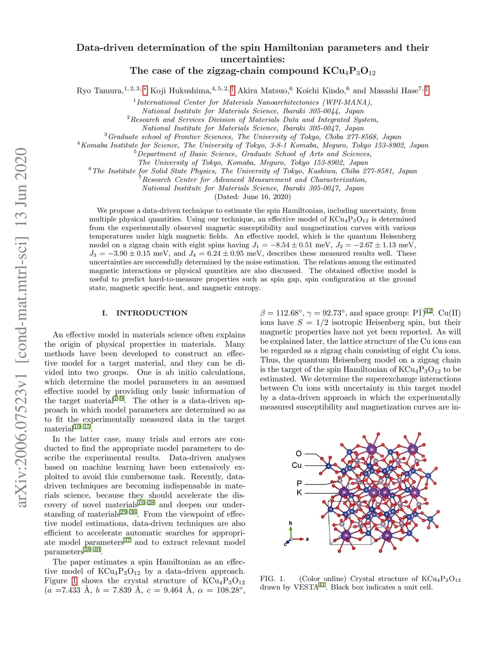 We propose a data-driven technique to estimate the spin Hamiltonian, including uncertainty, from multiple physical quantities. Using our technique, an effective model of KCuPO is determined from the experimentally observed magnetic susceptibility and magnetization curves with various temperatures under high magnetic fields. An effective model, which is the quantum Heisenberg model on a zigzag chain with eight spins having J_1= -8.54 \pm 0.51 \{\rm meV}, J_2 = -2.67 \pm 1.13 \{\rm meV}, J_3 = -3.90 \pm 0.15 \{\rm meV}, and J_4 = 6.24 \pm 0.95 \{\rm meV}, describes these measured results well. These uncertainties are successfully determined by the noise estimation. The relations among the estimated magnetic interactions or physical quantities are also discussed. The obtained effective model is useful to predict hard-to-measure properties such as spin gap, spin configuration at the ground state, magnetic specific heat, and magnetic entropy.