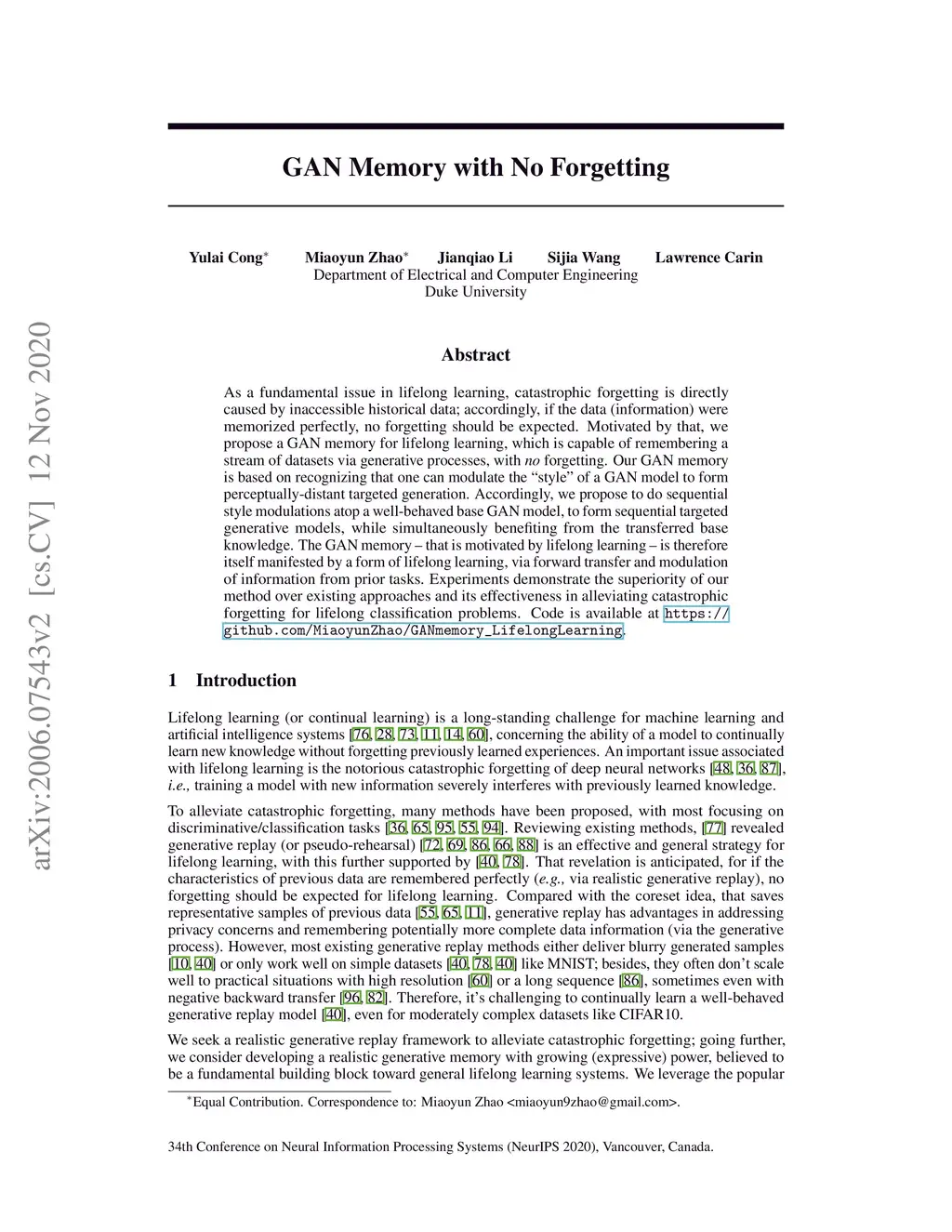 As a fundamental issue in lifelong learning, catastrophic forgetting is directly caused by inaccessible historical data; accordingly, if the data (information) were memorized perfectly, no forgetting should be expected. Motivated by that, we propose a GAN memory for lifelong learning, which is capable of remembering a stream of datasets via generative processes, with \emph{no} forgetting. Our GAN memory is based on recognizing that one can modulate the "style" of a GAN model to form perceptually-distant targeted generation. Accordingly, we propose to do sequential style modulations atop a well-behaved base GAN model, to form sequential targeted generative models, while simultaneously benefiting from the transferred base knowledge. The GAN memory -- that is motivated by lifelong learning -- is therefore itself manifested by a form of lifelong learning, via forward transfer and modulation of information from prior tasks. Experiments demonstrate the superiority of our method over existing approaches and its effectiveness in alleviating catastrophic forgetting for lifelong classification problems. Code is available at https://github.com/MiaoyunZhao/GANmemory_LifelongLearning.