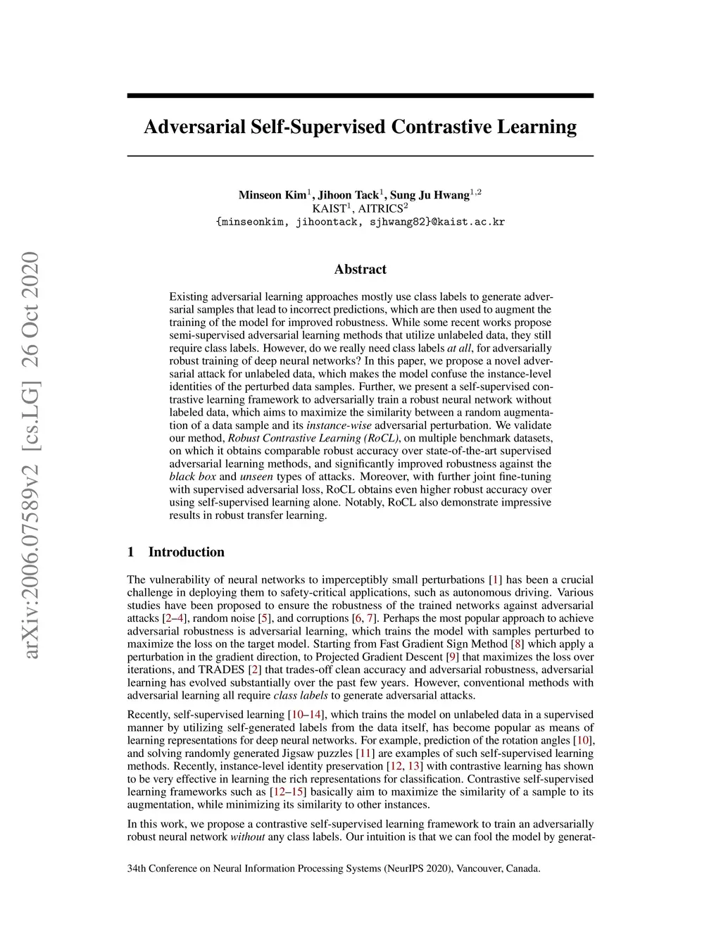 Existing adversarial learning approaches mostly use class labels to generate adversarial samples that lead to incorrect predictions, which are then used to augment the training of the model for improved robustness. While some recent works propose semi-supervised adversarial learning methods that utilize unlabeled data, they still require class labels. However, do we really need class labels at all, for adversarially robust training of deep neural networks? In this paper, we propose a novel adversarial attack for unlabeled data, which makes the model confuse the instance-level identities of the perturbed data samples. Further, we present a self-supervised contrastive learning framework to adversarially train a robust neural network without labeled data, which aims to maximize the similarity between a random augmentation of a data sample and its instance-wise adversarial perturbation. We validate our method, Robust Contrastive Learning (RoCL), on multiple benchmark datasets, on which it obtains comparable robust accuracy over state-of-the-art supervised adversarial learning methods, and significantly improved robustness against the black box and unseen types of attacks. Moreover, with further joint fine-tuning with supervised adversarial loss, RoCL obtains even higher robust accuracy over using self-supervised learning alone. Notably, RoCL also demonstrate impressive results in robust transfer learning.