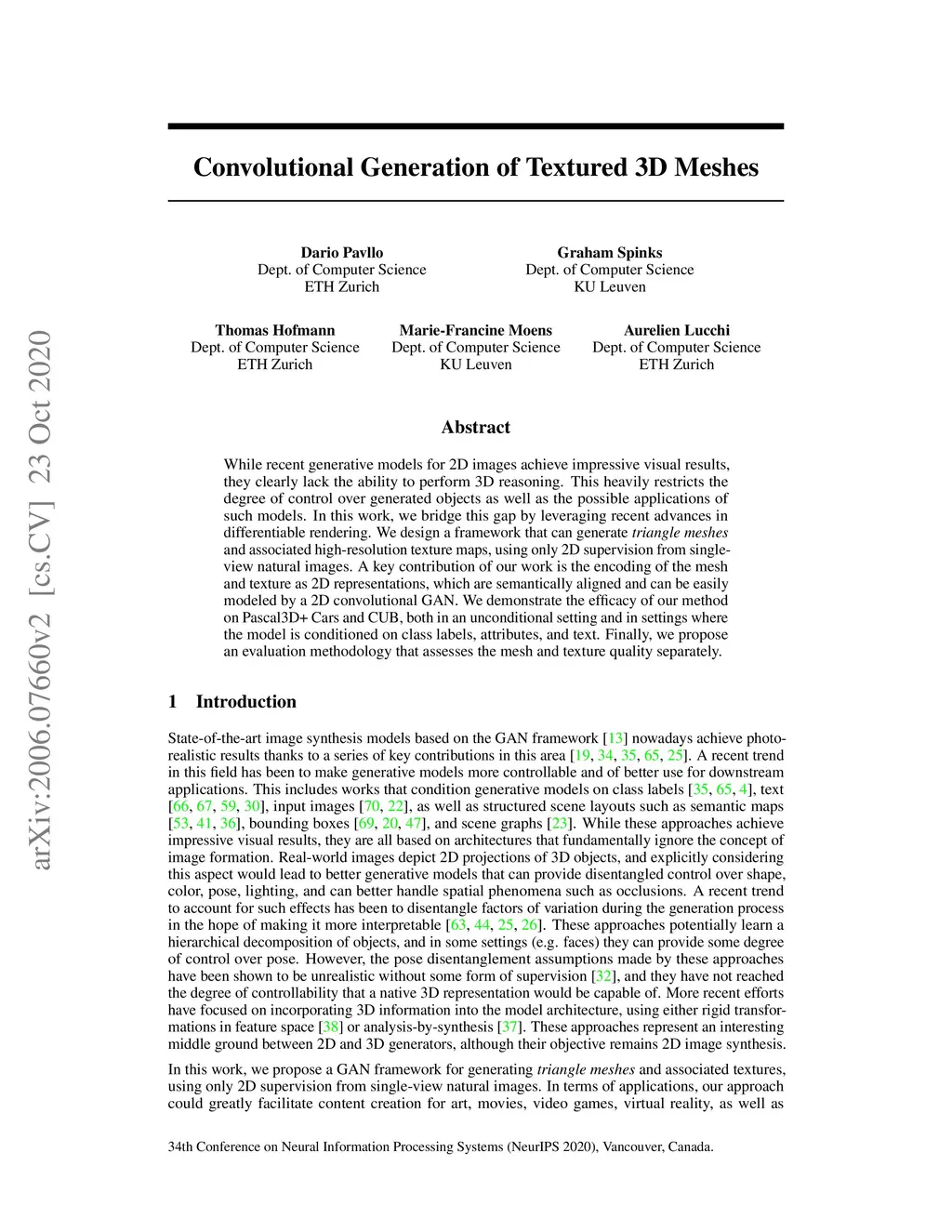 While recent generative models for 2D images achieve impressive visual results, they clearly lack the ability to perform 3D reasoning. This heavily restricts the degree of control over generated objects as well as the possible applications of such models. In this work, we bridge this gap by leveraging recent advances in differentiable rendering. We design a framework that can generate triangle meshes and associated high-resolution texture maps, using only 2D supervision from single-view natural images. A key contribution of our work is the encoding of the mesh and texture as 2D representations, which are semantically aligned and can be easily modeled by a 2D convolutional GAN. We demonstrate the efficacy of our method on Pascal3D+ Cars and CUB, both in an unconditional setting and in settings where the model is conditioned on class labels, attributes, and text. Finally, we propose an evaluation methodology that assesses the mesh and texture quality separately.