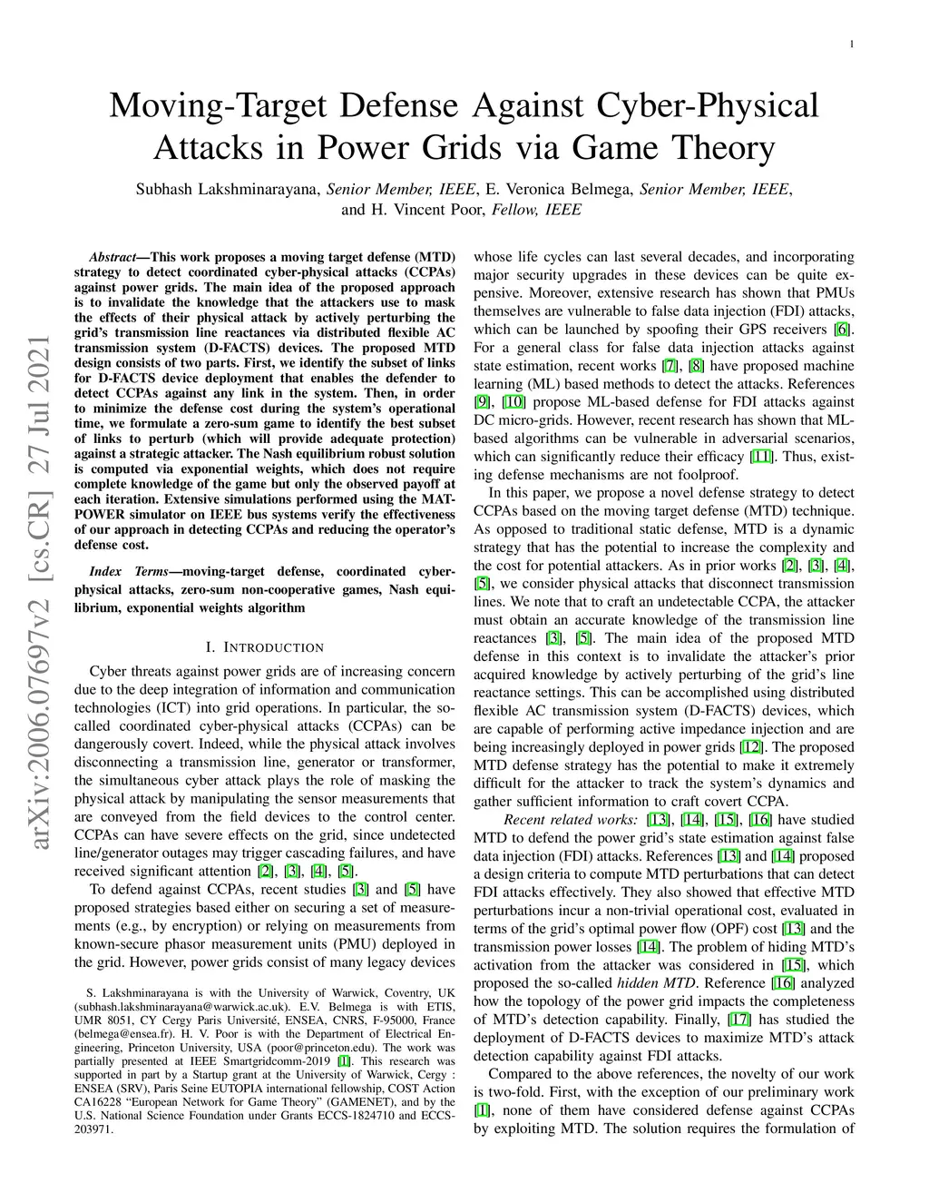 Moving-Target Defense Against Cyber-Physical Attacks in Power Grids via Game Theory