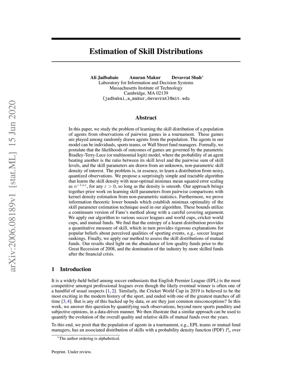 In this paper, we study the problem of learning the skill distribution of a population of agents from observations of pairwise games in a tournament. These games are played among randomly drawn agents from the population. The agents in our model can be individuals, sports teams, or Wall Street fund managers. Formally, we postulate that the likelihoods of game outcomes are governed by the Bradley-Terry-Luce (or multinomial logit) model, where the probability of an agent beating another is the ratio between its skill level and the pairwise sum of skill levels, and the skill parameters are drawn from an unknown skill density of interest. The problem is, in essence, to learn a distribution from noisy, quantized observations. We propose a simple and tractable algorithm that learns the skill density with near-optimal minimax mean squared error scaling as , for any , when the density is smooth. Our approach brings together prior work on learning skill parameters from pairwise comparisons with kernel density estimation from non-parametric statistics. Furthermore, we prove minimax lower bounds which establish minimax optimality of the skill parameter estimation technique used in our algorithm. These bounds utilize a continuum version of Fano's method along with a covering argument. We apply our algorithm to various soccer leagues and world cups, cricket world cups, and mutual funds. We find that the entropy of a learnt distribution provides a quantitative measure of skill, which provides rigorous explanations for popular beliefs about perceived qualities of sporting events, e.g., soccer league rankings. Finally, we apply our method to assess the skill distributions of mutual funds. Our results shed light on the abundance of low quality funds prior to the Great Recession of 2008, and the domination of the industry by more skilled funds after the financial crisis.