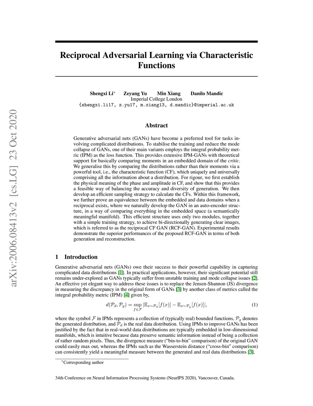 Generative adversarial nets (GANs) have become a preferred tool for tasks involving complicated distributions. To stabilise the training and reduce the mode collapse of GANs, one of their main variants employs the integral probability metric (IPM) as the loss function. This provides extensive IPM-GANs with theoretical support for basically comparing moments in an embedded domain of the \textit{critic}. We generalise this by comparing the distributions rather than their moments via a powerful tool, i.e., the characteristic function (CF), which uniquely and universally comprising all the information about a distribution. For rigour, we first establish the physical meaning of the phase and amplitude in CF, and show that this provides a feasible way of balancing the accuracy and diversity of generation. We then develop an efficient sampling strategy to calculate the CFs. Within this framework, we further prove an equivalence between the embedded and data domains when a reciprocal exists, where we naturally develop the GAN in an auto-encoder structure, in a way of comparing everything in the embedded space (a semantically meaningful manifold). This efficient structure uses only two modules, together with a simple training strategy, to achieve bi-directionally generating clear images, which is referred to as the reciprocal CF GAN (RCF-GAN). Experimental results demonstrate the superior performances of the proposed RCF-GAN in terms of both generation and reconstruction.