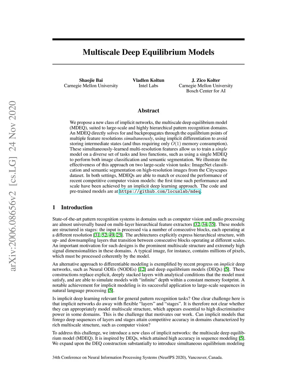 We propose a new class of implicit networks, the multiscale deep equilibrium model (MDEQ), suited to large-scale and highly hierarchical pattern recognition domains. An MDEQ directly solves for and backpropagates through the equilibrium points of multiple feature resolutions simultaneously, using implicit differentiation to avoid storing intermediate states (and thus requiring only memory consumption). These simultaneously-learned multi-resolution features allow us to train a single model on a diverse set of tasks and loss functions, such as using a single MDEQ to perform both image classification and semantic segmentation. We illustrate the effectiveness of this approach on two large-scale vision tasks: ImageNet classification and semantic segmentation on high-resolution images from the Cityscapes dataset. In both settings, MDEQs are able to match or exceed the performance of recent competitive computer vision models: the first time such performance and scale have been achieved by an implicit deep learning approach. The code and pre-trained models are at https://github.com/locuslab/mdeq .