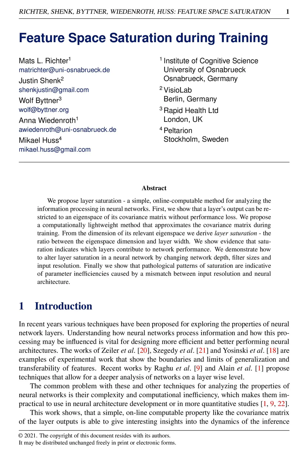 We propose layer saturation - a simple, online-computable method for analyzing the information processing in neural networks. First, we show that a layer's output can be restricted to the eigenspace of its variance matrix without performance loss. We propose a computationally lightweight method for approximating the variance matrix during training. From the dimension of its lossless eigenspace we derive layer saturation - the ratio between the eigenspace dimension and layer width. We show that saturation seems to indicate which layers contribute to network performance. We demonstrate how to alter layer saturation in a neural network by changing network depth, filter sizes and input resolution. Furthermore, we show that well-chosen input resolution increases network performance by distributing the inference process more evenly across the network.