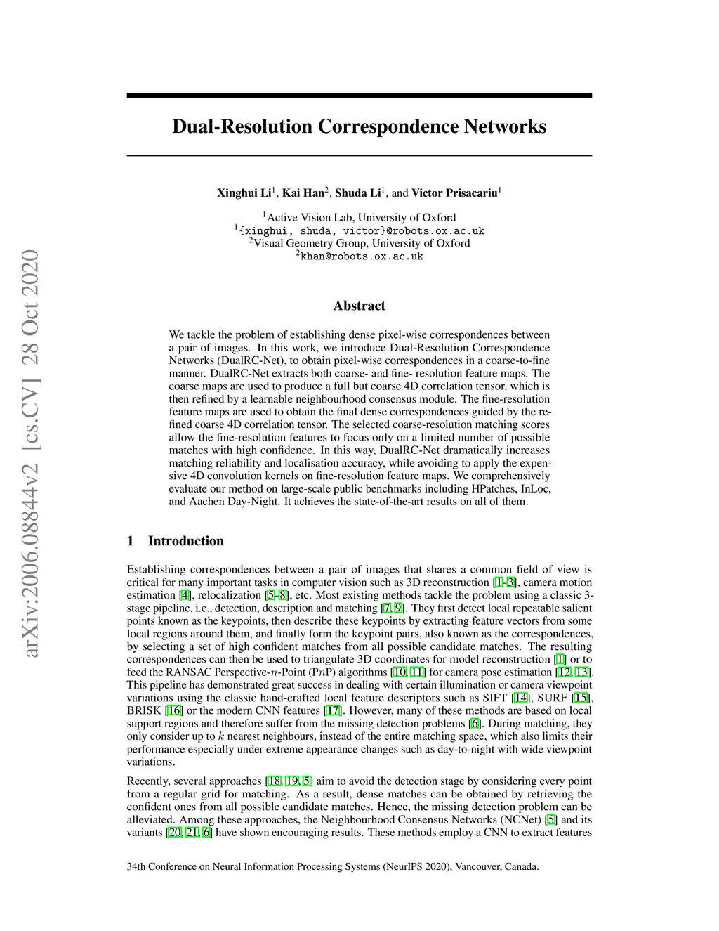 We tackle the problem of establishing dense pixel-wise correspondences between a pair of images. In this work, we introduce Dual-Resolution Correspondence Networks (DualRC-Net), to obtain pixel-wise correspondences in a coarse-to-fine manner. DualRC-Net extracts both coarse- and fine- resolution feature maps. The coarse maps are used to produce a full but coarse 4D correlation tensor, which is then refined by a learnable neighbourhood consensus module. The fine-resolution feature maps are used to obtain the final dense correspondences guided by the refined coarse 4D correlation tensor. The selected coarse-resolution matching scores allow the fine-resolution features to focus only on a limited number of possible matches with high confidence. In this way, DualRC-Net dramatically increases matching reliability and localisation accuracy, while avoiding to apply the expensive 4D convolution kernels on fine-resolution feature maps. We comprehensively evaluate our method on large-scale public benchmarks including HPatches, InLoc, and Aachen Day-Night. It achieves the state-of-the-art results on all of them.