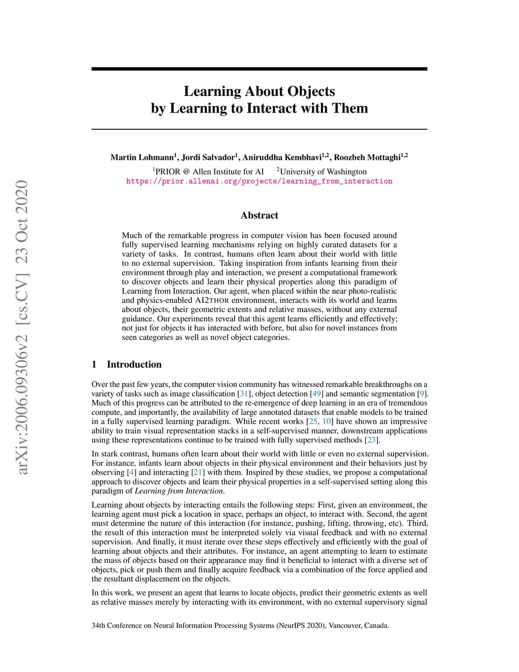 Much of the remarkable progress in computer vision has been focused around fully supervised learning mechanisms relying on highly curated datasets for a variety of tasks. In contrast, humans often learn about their world with little to no external supervision. Taking inspiration from infants learning from their environment through play and interaction, we present a computational framework to discover objects and learn their physical properties along this paradigm of Learning from Interaction. Our agent, when placed within the near photo-realistic and physics-enabled AI2-THOR environment, interacts with its world and learns about objects, their geometric extents and relative masses, without any external guidance. Our experiments reveal that this agent learns efficiently and effectively; not just for objects it has interacted with before, but also for novel instances from seen categories as well as novel object categories.