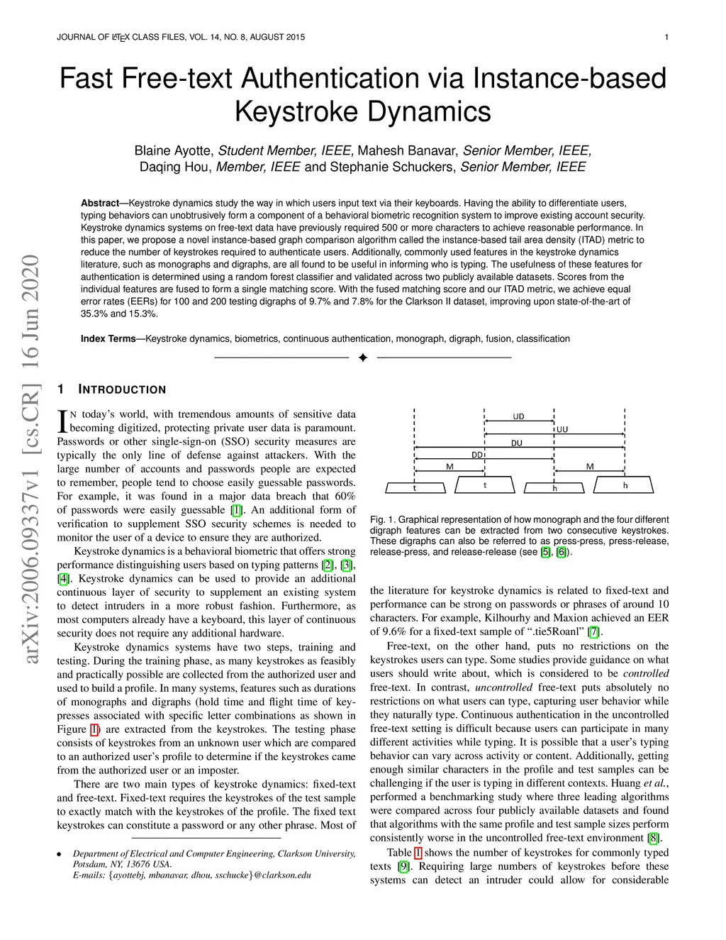 Keystroke dynamics study the way in which users input text via their keyboards. Having the ability to differentiate users, typing behaviors can unobtrusively form a component of a behavioral biometric recognition system to improve existing account security. Keystroke dynamics systems on free-text data have previously required 500 or more characters to achieve reasonable performance. In this paper, we propose a novel instance-based graph comparison algorithm called the instance-based tail area density (ITAD) metric to reduce the number of keystrokes required to authenticate users. Additionally, commonly used features in the keystroke dynamics literature, such as monographs and digraphs, are all found to be useful in informing who is typing. The usefulness of these features for authentication is determined using a random forest classifier and validated across two publicly available datasets. Scores from the individual features are fused to form a single matching score. With the fused matching score and our ITAD metric, we achieve equal error rates (EERs) for 100 and 200 testing digraphs of 9.7% and 7.8% for the Clarkson II dataset, improving upon state-of-the-art of 35.3% and 15.3%.