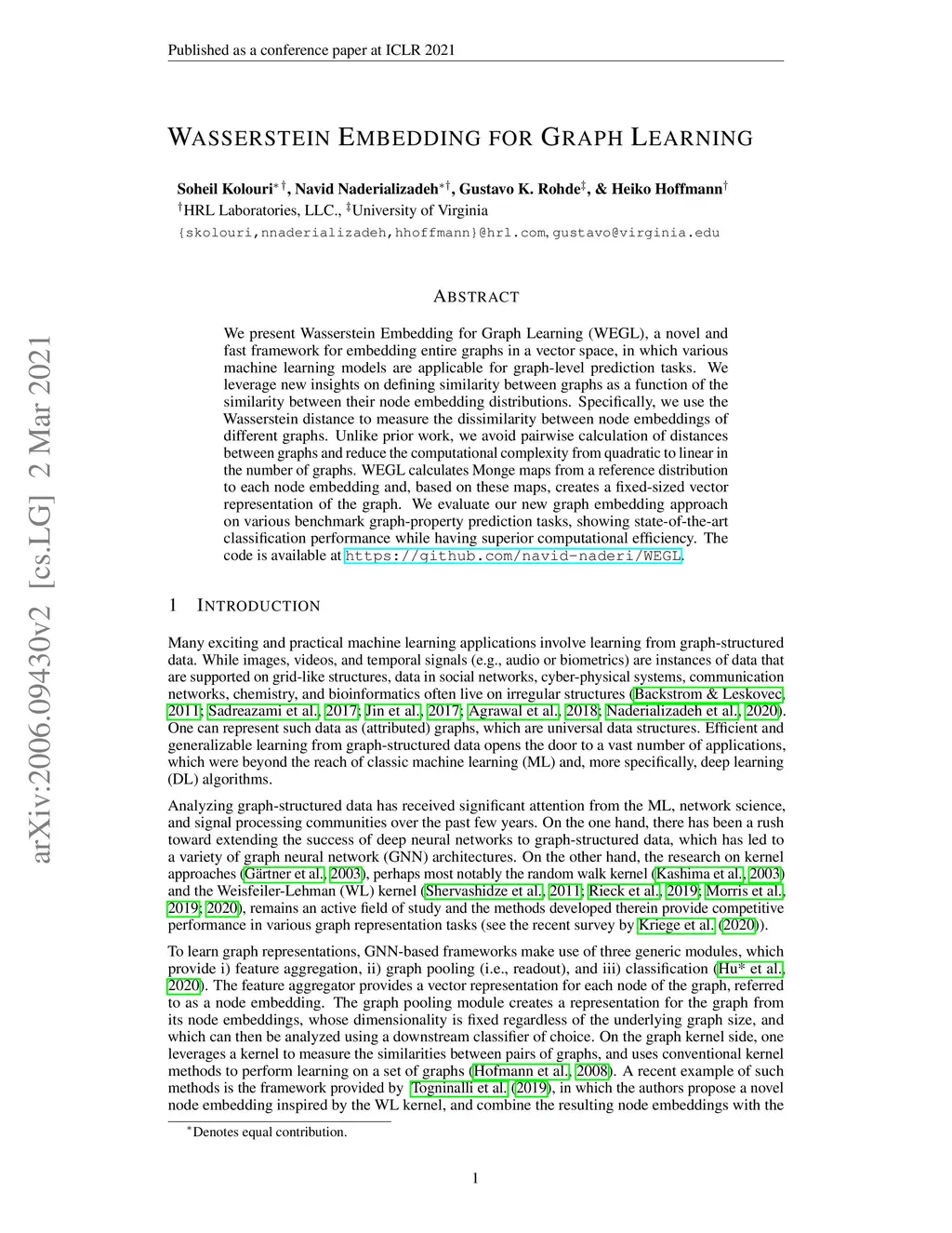 Wasserstein Embedding for Graph Learning