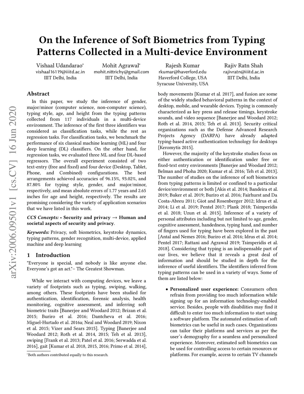 On the Inference of Soft Biometrics from Typing Patterns Collected in a