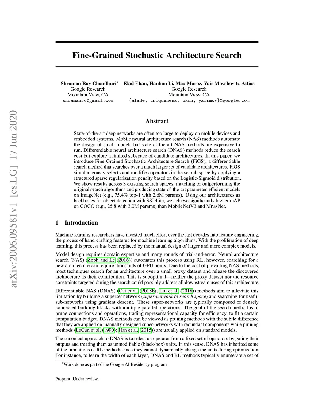 State-of-the-art deep networks are often too large to deploy on mobile devices and embedded systems. Mobile neural architecture search (NAS) methods automate the design of small models but state-of-the-art NAS methods are expensive to run. Differentiable neural architecture search (DNAS) methods reduce the search cost but explore a limited subspace of candidate architectures. In this paper, we introduce Fine-Grained Stochastic Architecture Search (FiGS), a differentiable search method that searches over a much larger set of candidate architectures. FiGS simultaneously selects and modifies operators in the search space by applying a structured sparse regularization penalty based on the Logistic-Sigmoid distribution. We show results across 3 existing search spaces, matching or outperforming the original search algorithms and producing state-of-the-art parameter-efficient models on ImageNet (e.g., 75.4% top-1 with 2.6M params). Using our architectures as backbones for object detection with SSDLite, we achieve significantly higher mAP on COCO (e.g., 25.8 with 3.0M params) than MobileNetV3 and MnasNet.