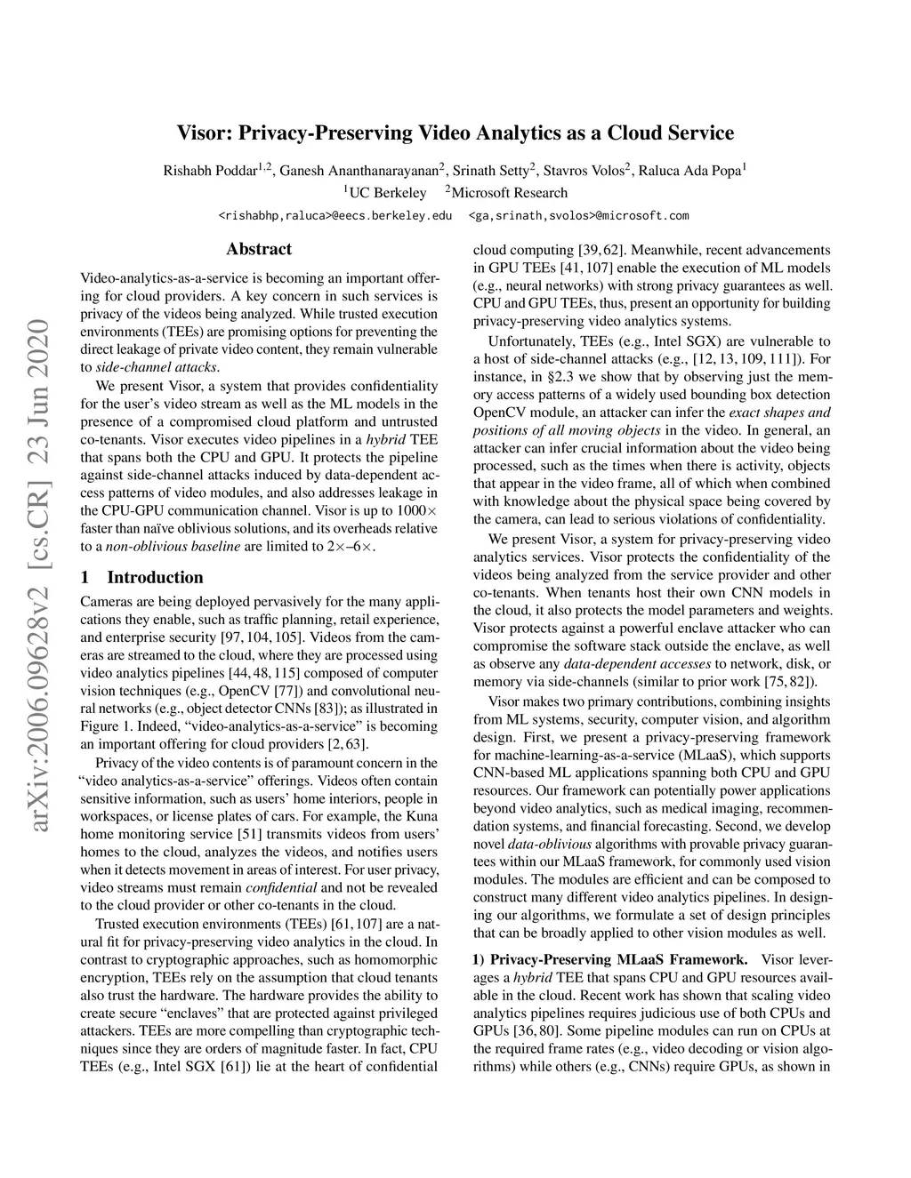 Video-analytics-as-a-service is becoming an important offering for cloud providers. A key concern in such services is privacy of the videos being analyzed. While trusted execution environments (TEEs) are promising options for preventing the direct leakage of private video content, they remain vulnerable to side-channel attacks. We present Visor, a system that provides confidentiality for the user's video stream as well as the ML models in the presence of a compromised cloud platform and untrusted co-tenants. Visor executes video pipelines in a hybrid TEE that spans both the CPU and GPU. It protects the pipeline against side-channel attacks induced by data-dependent access patterns of video modules, and also addresses leakage in the CPU-GPU communication channel. Visor is up to faster than na\"ive oblivious solutions, and its overheads relative to a non-oblivious baseline are limited to --.