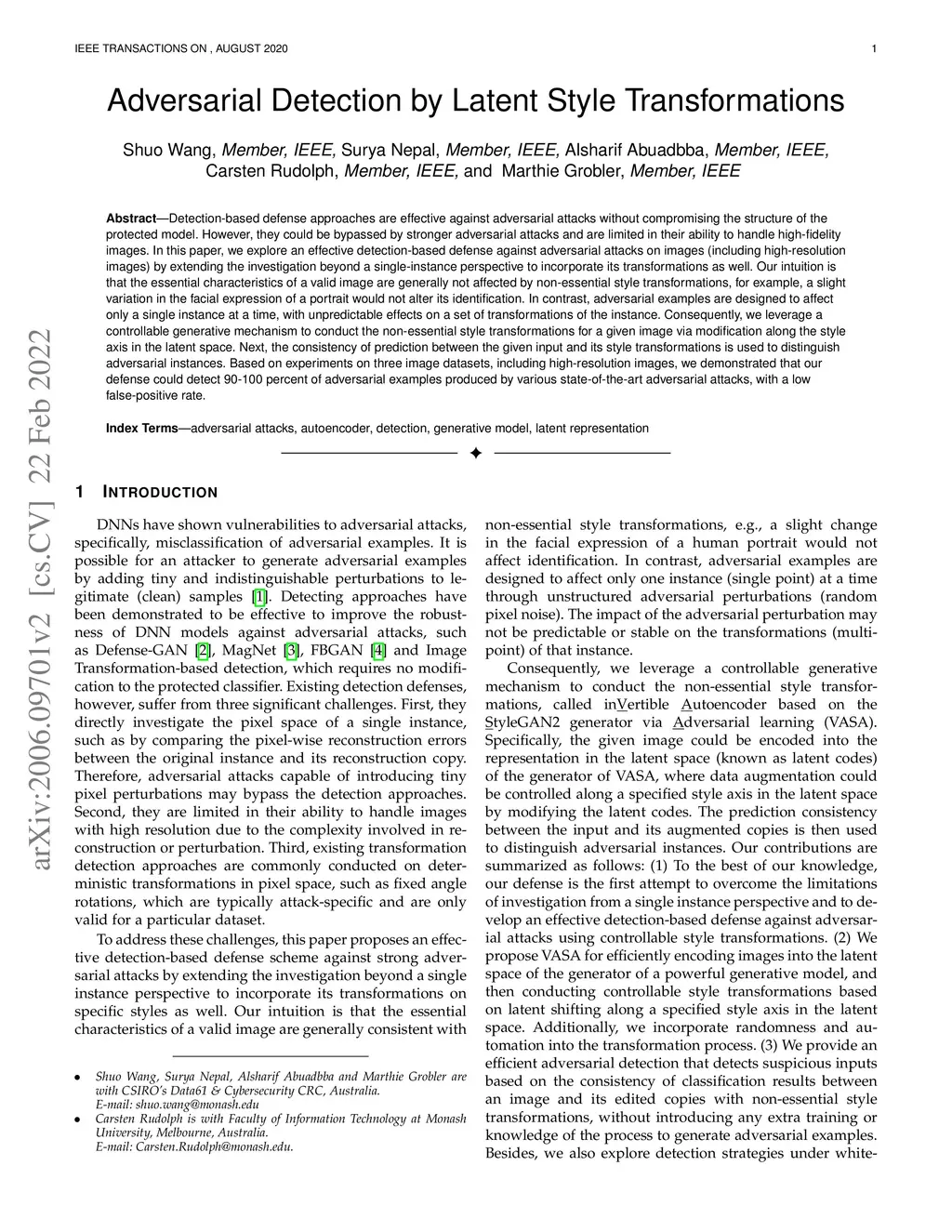 Machine learning models have demonstrated vulnerability to adversarial attacks, more specifically misclassification of adversarial examples. In this paper, we investigate an attack-agnostic defense against adversarial attacks on high-resolution images by detecting suspicious inputs. The intuition behind our approach is that the essential characteristics of a normal image are generally consistent with non-essential style transformations, e.g., slightly changing the facial expression of human portraits. In contrast, adversarial examples are generally sensitive to such transformations. In our approach to detect adversarial instances, we propose an in\underline{V}ertible \underline{A}utoencoder based on the \underline{S}tyleGAN2 generator via \underline{A}dversarial training (VASA) to inverse images to disentangled latent codes that reveal hierarchical styles. We then build a set of edited copies with non-essential style transformations by performing latent shifting and reconstruction, based on the correspondences between latent codes and style transformations. The classification-based consistency of these edited copies is used to distinguish adversarial instances.