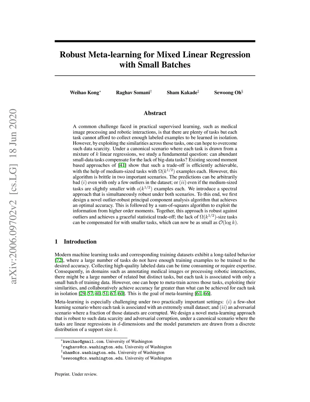 Robust Meta-learning for Mixed Linear Regression with Small Batches