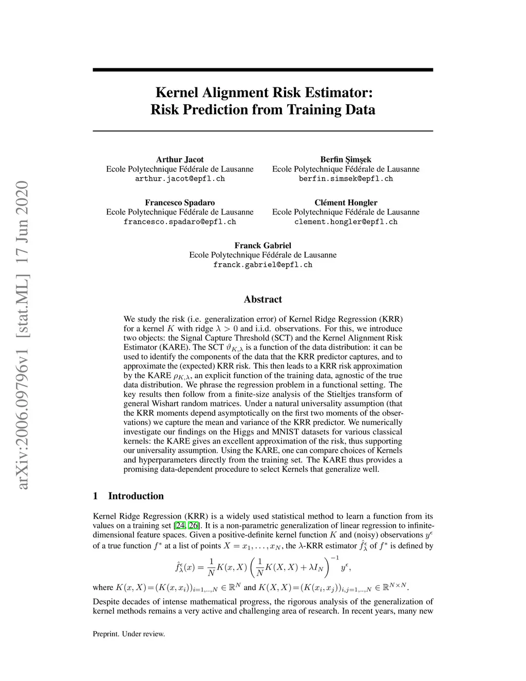 We study the risk (i.e. generalization error) of Kernel Ridge Regression (KRR) for a kernel with ridge and i.i.d. observations. For this, we introduce two objects: the Signal Capture Threshold (SCT) and the Kernel Alignment Risk Estimator (KARE). The SCT is a function of the data distribution: it can be used to identify the components of the data that the KRR predictor captures, and to approximate the (expected) KRR risk. This then leads to a KRR risk approximation by the KARE , an explicit function of the training data, agnostic of the true data distribution. We phrase the regression problem in a functional setting. The key results then follow from a finite-size analysis of the Stieltjes transform of general Wishart random matrices. Under a natural universality assumption (that the KRR moments depend asymptotically on the first two moments of the observations) we capture the mean and variance of the KRR predictor. We numerically investigate our findings on the Higgs and MNIST datasets for various classical kernels: the KARE gives an excellent approximation of the risk, thus supporting our universality assumption. Using the KARE, one can compare choices of Kernels and hyperparameters directly from the training set. The KARE thus provides a promising data-dependent procedure to select Kernels that generalize well.
