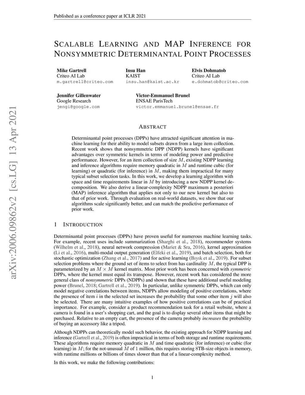 Scalable Learning and MAP Inference for Nonsymmetric Determinantal Point