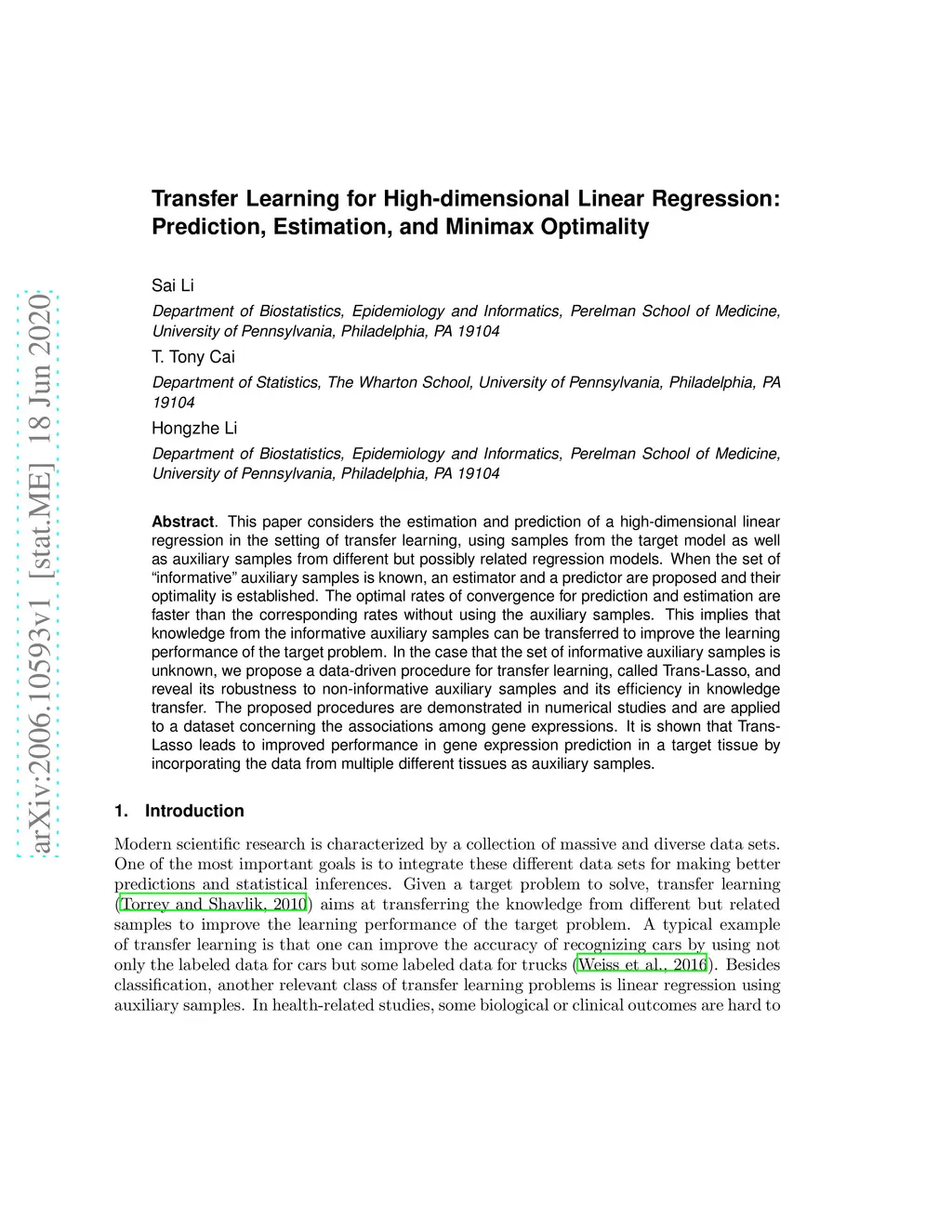 This paper considers the estimation and prediction of a high-dimensional linear regression in the setting of transfer learning, using samples from the target model as well as auxiliary samples from different but possibly related regression models. When the set of "informative" auxiliary samples is known, an estimator and a predictor are proposed and their optimality is established. The optimal rates of convergence for prediction and estimation are faster than the corresponding rates without using the auxiliary samples. This implies that knowledge from the informative auxiliary samples can be transferred to improve the learning performance of the target problem. In the case that the set of informative auxiliary samples is unknown, we propose a data-driven procedure for transfer learning, called Trans-Lasso, and reveal its robustness to non-informative auxiliary samples and its efficiency in knowledge transfer. The proposed procedures are demonstrated in numerical studies and are applied to a dataset concerning the associations among gene expressions. It is shown that Trans-Lasso leads to improved performance in gene expression prediction in a target tissue by incorporating the data from multiple different tissues as auxiliary samples.