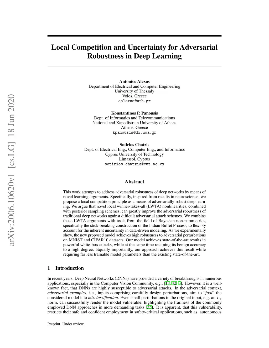 This work attempts to address adversarial robustness of deep networks by means of novel learning arguments. Specifically, inspired from results in neuroscience, we propose a local competition principle as a means of adversarially-robust deep learning. We argue that novel local winner-takes-all (LWTA) nonlinearities, combined with posterior sampling schemes, can greatly improve the adversarial robustness of traditional deep networks against difficult adversarial attack schemes. We combine these LWTA arguments with tools from the field of Bayesian non-parametrics, specifically the stick-breaking construction of the Indian Buffet Process, to flexibly account for the inherent uncertainty in data-driven modeling. As we experimentally show, the new proposed model achieves high robustness to adversarial perturbations on MNIST and CIFAR10 datasets. Our model achieves state-of-the-art results in powerful white-box attacks, while at the same time retaining its benign accuracy to a high degree. Equally importantly, our approach achieves this result while requiring far less trainable model parameters than the existing state-of-the-art.