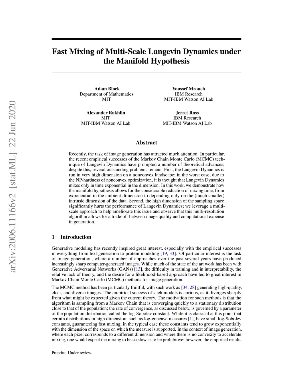 Recently, the task of image generation has attracted much attention. In particular, the recent empirical successes of the Markov Chain Monte Carlo (MCMC) technique of Langevin Dynamics have prompted a number of theoretical advances; despite this, several outstanding problems remain. First, the Langevin Dynamics is run in very high dimension on a nonconvex landscape; in the worst case, due to the NP-hardness of nonconvex optimization, it is thought that Langevin Dynamics mixes only in time exponential in the dimension. In this work, we demonstrate how the manifold hypothesis allows for the considerable reduction of mixing time, from exponential in the ambient dimension to depending only on the (much smaller) intrinsic dimension of the data. Second, the high dimension of the sampling space significantly hurts the performance of Langevin Dynamics; we leverage a multi-scale approach to help ameliorate this issue and observe that this multi-resolution algorithm allows for a trade-off between image quality and computational expense in generation.