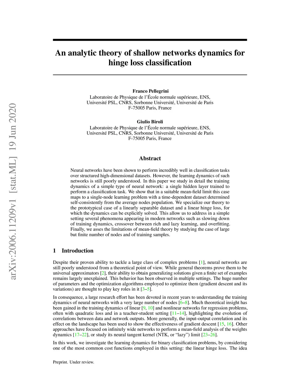 Neural networks have been shown to perform incredibly well in classification tasks over structured high-dimensional datasets. However, the learning dynamics of such networks is still poorly understood. In this paper we study in detail the training dynamics of a simple type of neural network: a single hidden layer trained to perform a classification task. We show that in a suitable mean-field limit this case maps to a single-node learning problem with a time-dependent dataset determined self-consistently from the average nodes population. We specialize our theory to the prototypical case of a linearly separable dataset and a linear hinge loss, for which the dynamics can be explicitly solved. This allow us to address in a simple setting several phenomena appearing in modern networks such as slowing down of training dynamics, crossover between rich and lazy learning, and overfitting. Finally, we asses the limitations of mean-field theory by studying the case of large but finite number of nodes and of training samples.