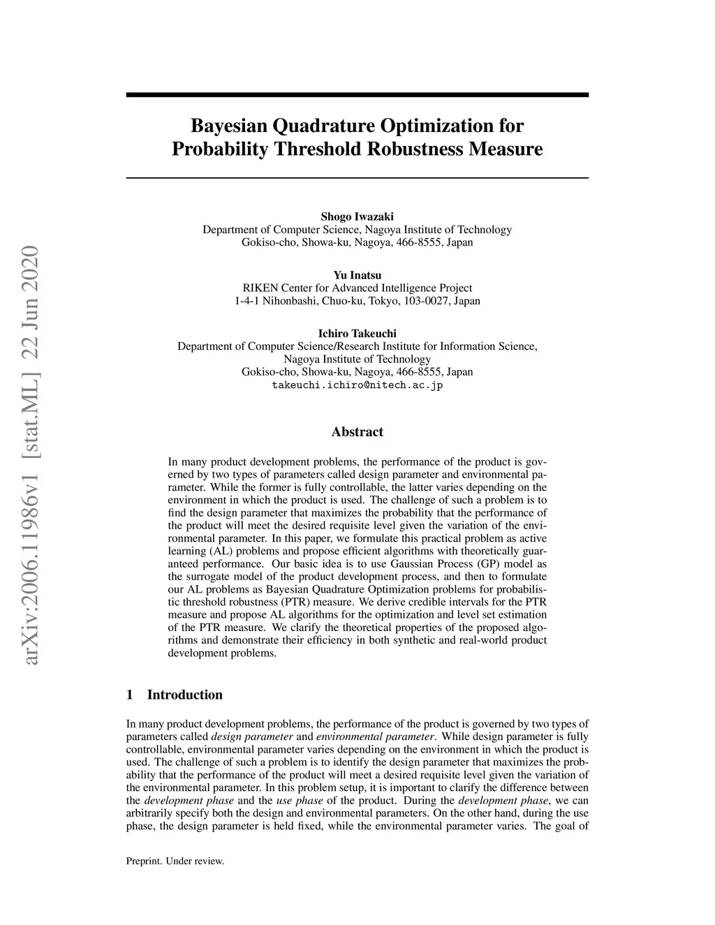 In many product development problems, the performance of the product is governed by two types of parameters called design parameter and environmental parameter. While the former is fully controllable, the latter varies depending on the environment in which the product is used. The challenge of such a problem is to find the design parameter that maximizes the probability that the performance of the product will meet the desired requisite level given the variation of the environmental parameter. In this paper, we formulate this practical problem as active learning (AL) problems and propose efficient algorithms with theoretically guaranteed performance. Our basic idea is to use Gaussian Process (GP) model as the surrogate model of the product development process, and then to formulate our AL problems as Bayesian Quadrature Optimization problems for probabilistic threshold robustness (PTR) measure. We derive credible intervals for the PTR measure and propose AL algorithms for the optimization and level set estimation of the PTR measure. We clarify the theoretical properties of the proposed algorithms and demonstrate their efficiency in both synthetic and real-world product development problems.