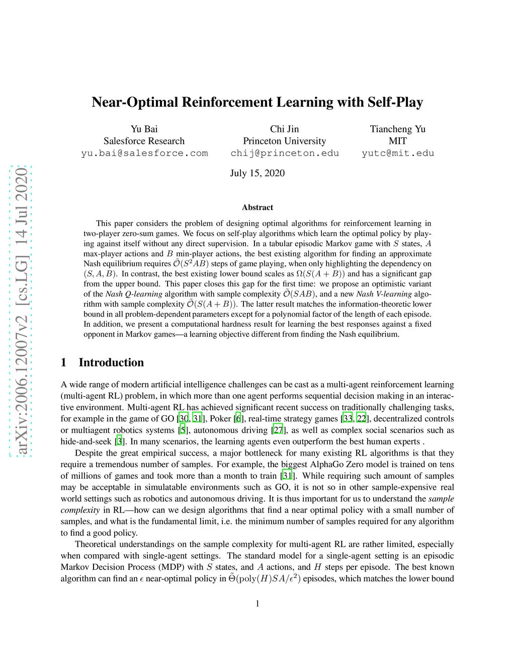 This paper considers the problem of designing optimal algorithms for reinforcement learning in two-player zero-sum games. We focus on self-play algorithms which learn the optimal policy by playing against itself without any direct supervision. In a tabular episodic Markov game with states, max-player actions and min-player actions, the best existing algorithm for finding an approximate Nash equilibrium requires steps of game playing, when only highlighting the dependency on . In contrast, the best existing lower bound scales as and has a significant gap from the upper bound. This paper closes this gap for the first time: we propose an optimistic variant of the \emph{Nash Q-learning} algorithm with sample complexity , and a new \emph{Nash V-learning} algorithm with sample complexity . The latter result matches the information-theoretic lower bound in all problem-dependent parameters except for a polynomial factor of the length of each episode. In addition, we present a computational hardness result for learning the best responses against a fixed opponent in Markov games---a learning objective different from finding the Nash equilibrium.