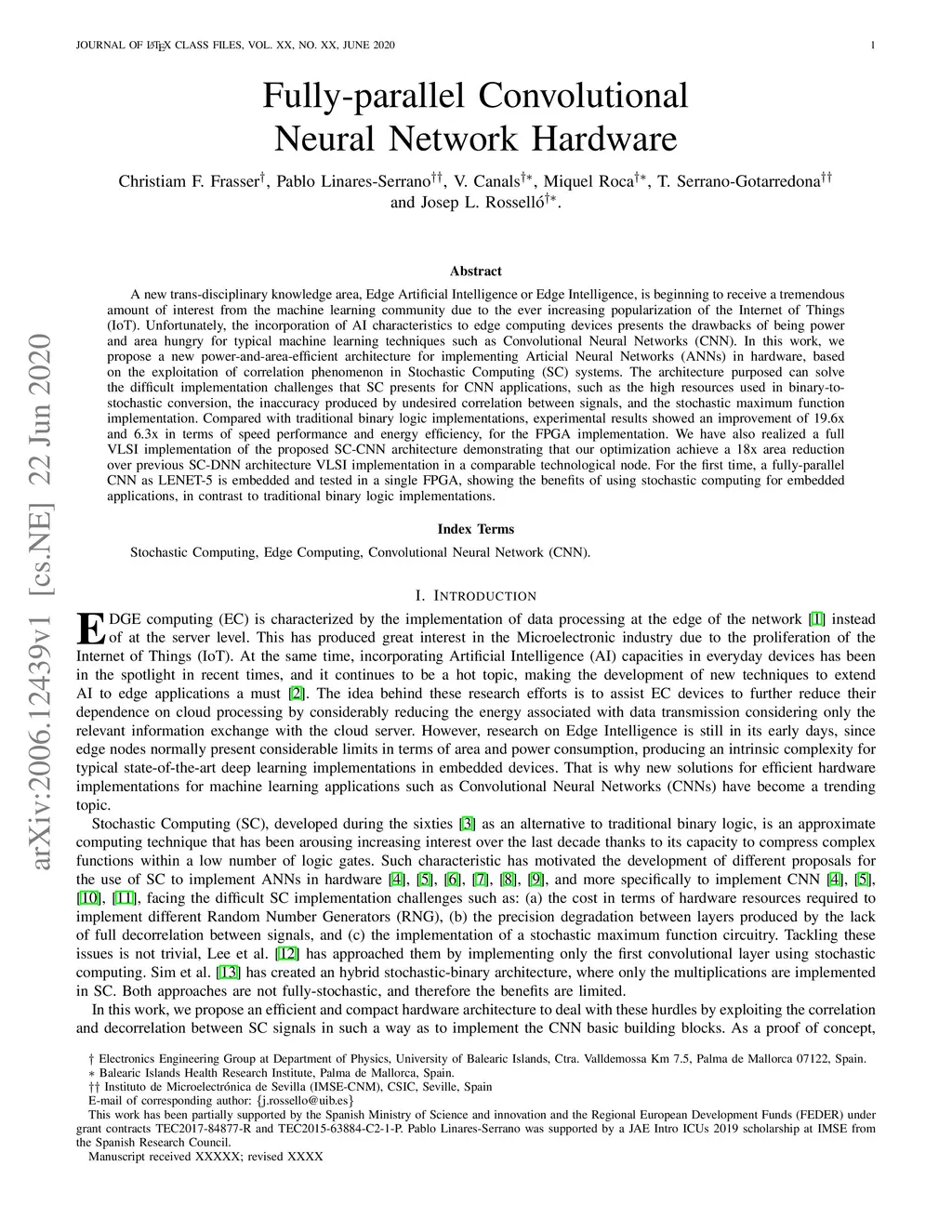 A new trans-disciplinary knowledge area, Edge Artificial Intelligence or Edge Intelligence, is beginning to receive a tremendous amount of interest from the machine learning community due to the ever increasing popularization of the Internet of Things (IoT). Unfortunately, the incorporation of AI characteristics to edge computing devices presents the drawbacks of being power and area hungry for typical machine learning techniques such as Convolutional Neural Networks (CNN). In this work, we propose a new power-and-area-efficient architecture for implementing Articial Neural Networks (ANNs) in hardware, based on the exploitation of correlation phenomenon in Stochastic Computing (SC) systems. The architecture purposed can solve the difficult implementation challenges that SC presents for CNN applications, such as the high resources used in binary-tostochastic conversion, the inaccuracy produced by undesired correlation between signals, and the stochastic maximum function implementation. Compared with traditional binary logic implementations, experimental results showed an improvement of 19.6x and 6.3x in terms of speed performance and energy efficiency, for the FPGA implementation. We have also realized a full VLSI implementation of the proposed SC-CNN architecture demonstrating that our optimization achieve a 18x area reduction over previous SC-DNN architecture VLSI implementation in a comparable technological node. For the first time, a fully-parallel CNN as LENET-5 is embedded and tested in a single FPGA, showing the benefits of using stochastic computing for embedded applications, in contrast to traditional binary logic implementations.